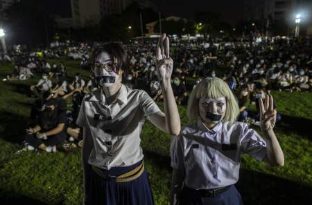 Pro-democracy hashtags linked to high school protests were trending on social media with photographs and videos showing young students at schools in a number of cities lined up on playgrounds and giving the salutes during the compulsory daily singing of the national anthem.