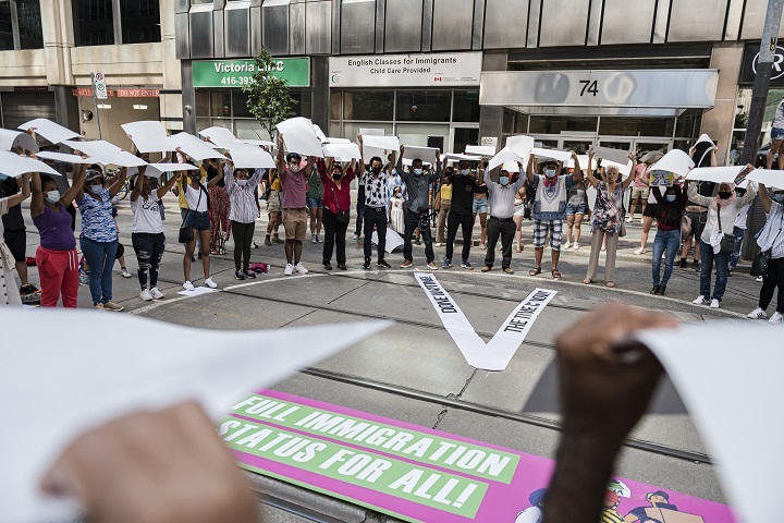 Activists staged a demonstration in front of a government immigration office in Toronto on Sunday to protest what they say is unjust treatment of migrant workers during the COVID-19 pandemic.