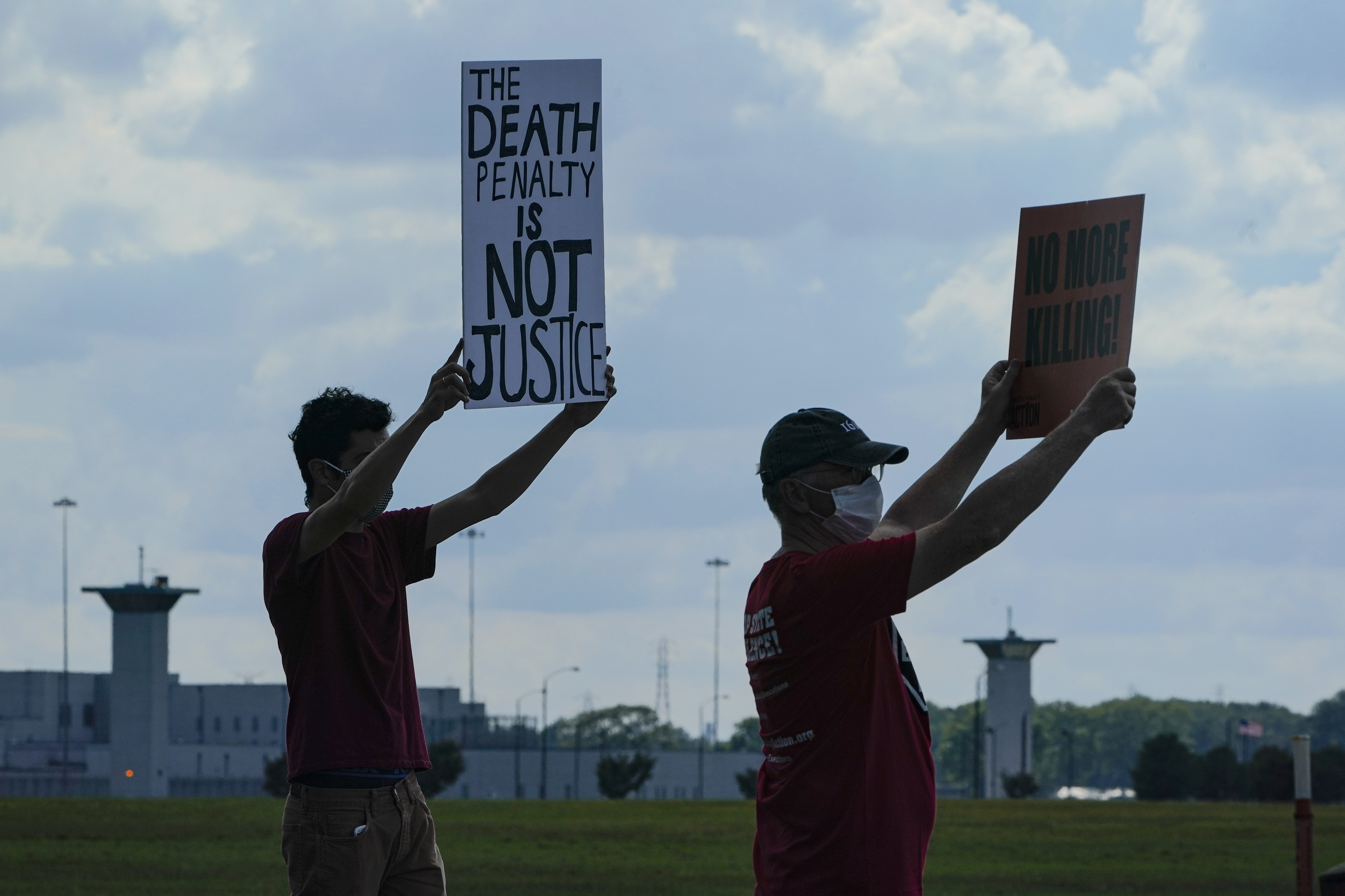 Among several anti-death penalty protesters at an intersection across the street from the prison was Sister Barbara Battista, who was wearing face mask with block letters on the front that read, “Abolish the death penalty.”