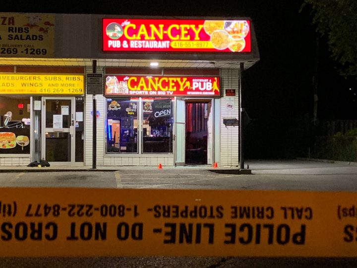 Officers could be seen at a bar on Danforth Road near the intersection, north of Eglinton Avenue East. Video surveillance obtained by Global News showed the front door of the bar shattering as two people ran away.