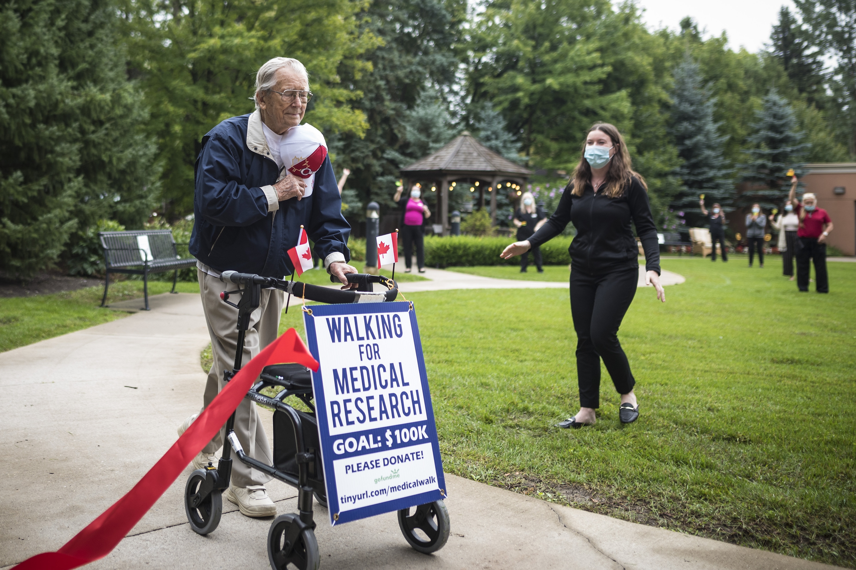 George Markow took off his red-and-white baseball cap and placed it over his heart, to the cheers of onlookers, as he finished walking his 100th kilometre to help raise funds to fight COVID-19.