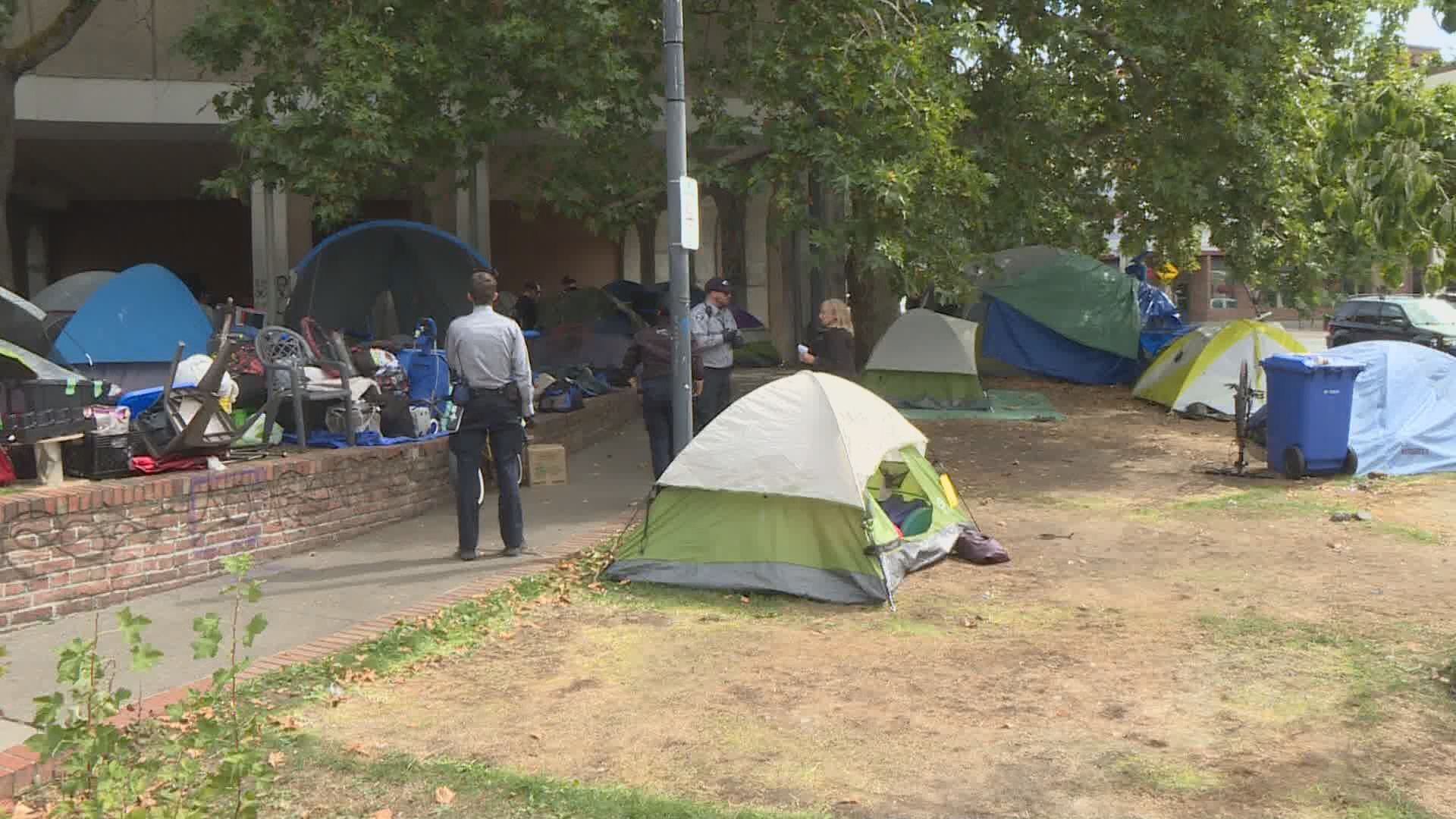 The city cleared a homeless encampment from the square on Tuesday, amid escalating crime and violence in the area.