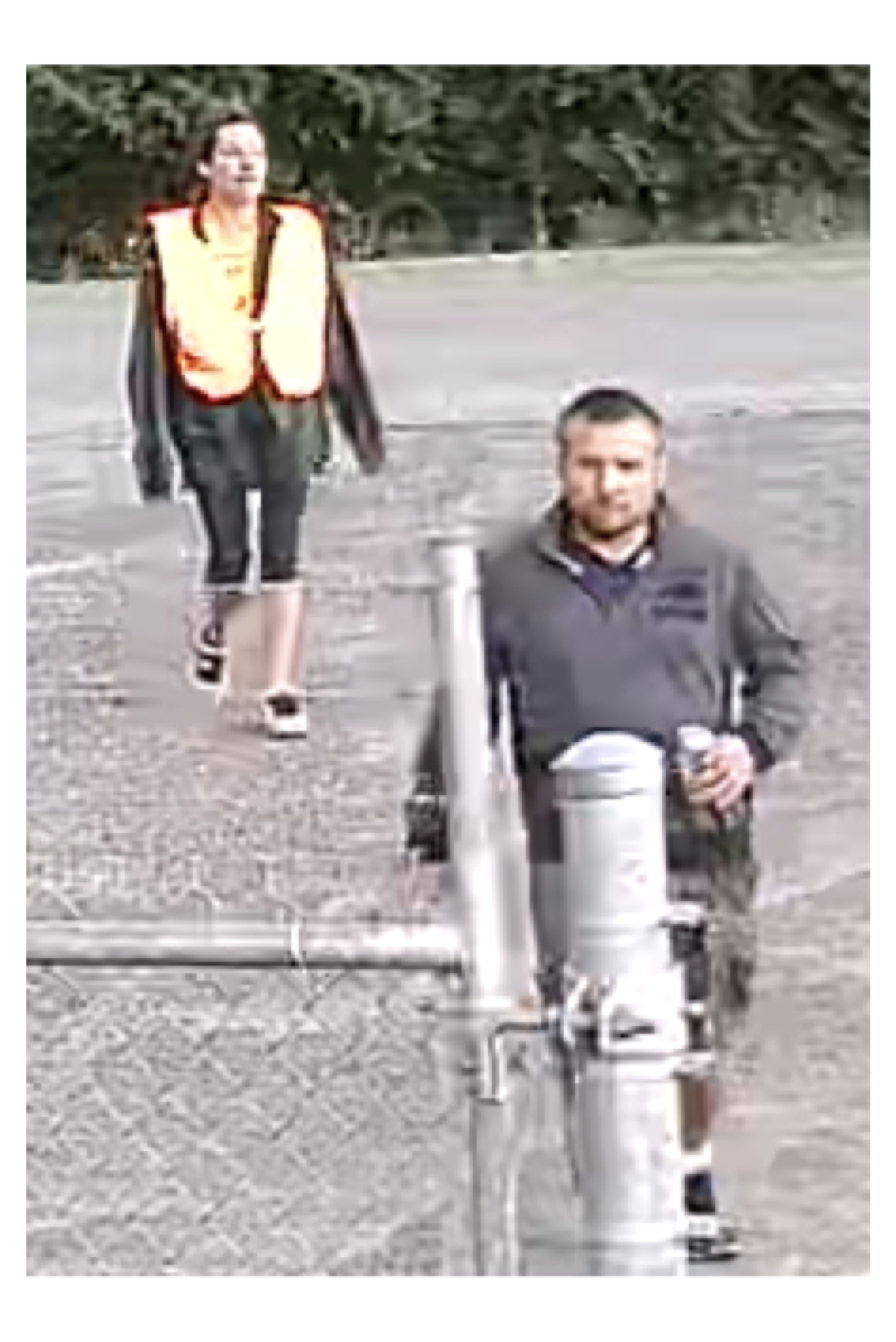 The other is a woman in his 30s with black hair who was wearing black capri pants and a long-sleeve dark shirt with an orange traffic vest.