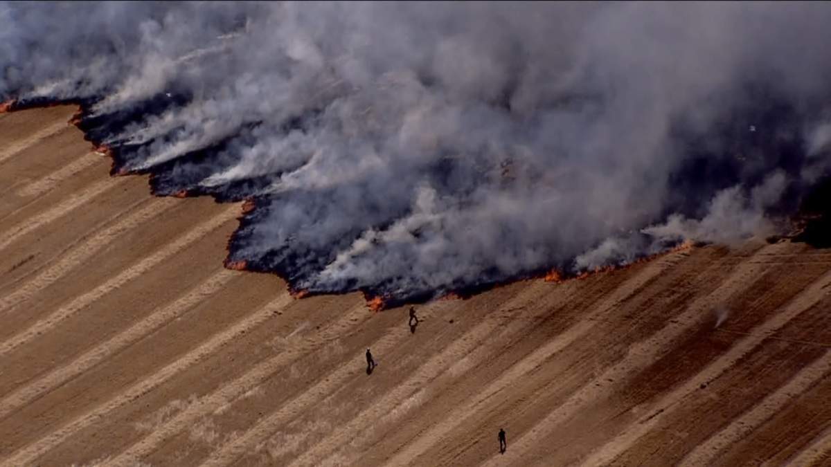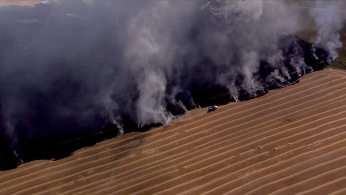 In an update just before 12:30 p.m., emergency crews said about 80 acres of grass and chaff from a crop had burned.