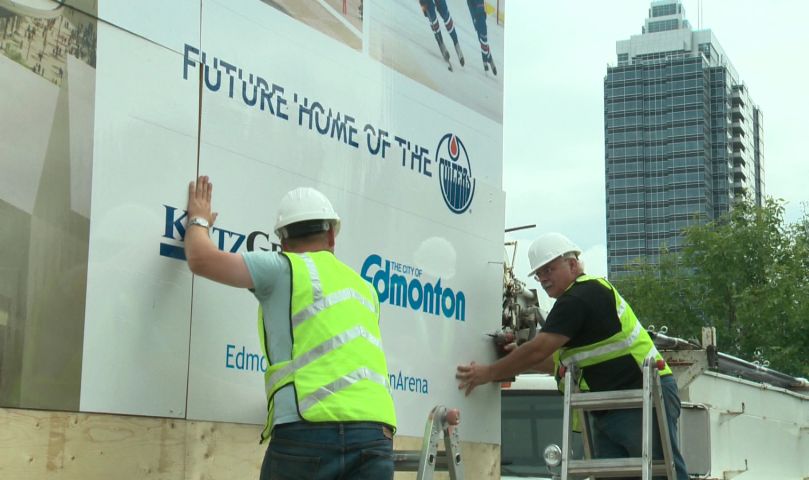 EDMONTON – New signs at the site of Edmonton’s new downtown arena went up Monday, as officials celebrated the development of the arena district.