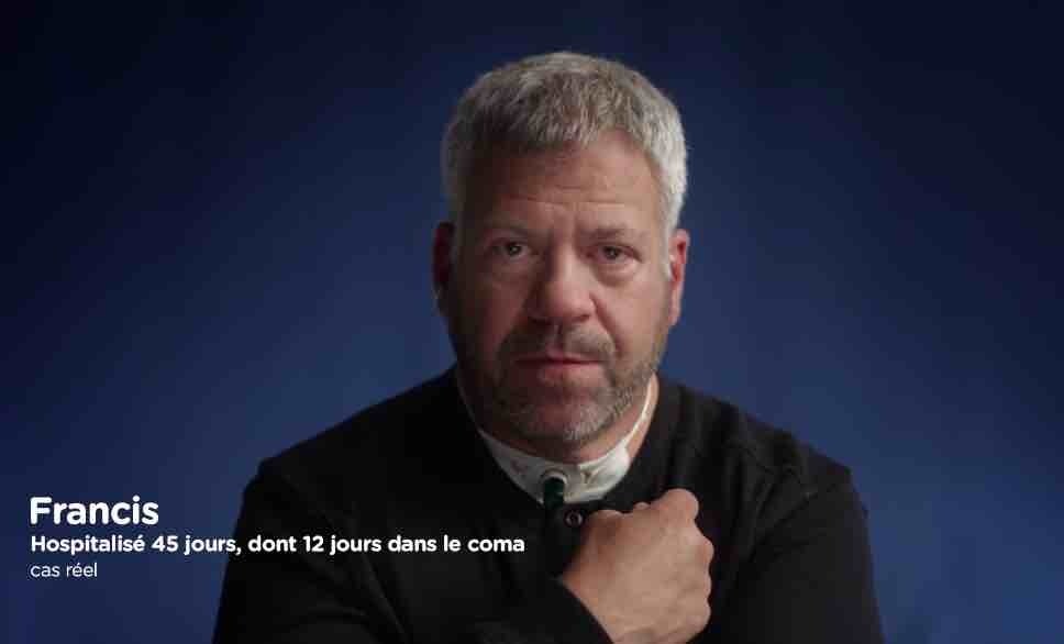 The ad shows a man named Francis, not an actor but a real recovered COVID-19 patient, who speaks to the camera with a breathing tube through his throat. He tells the story of his experience with the coronavirus.