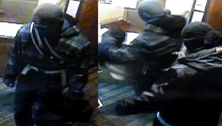The first suspect is between 5’8” and 5’10” and was wearing a grey plaid jacket and grey balaclava.