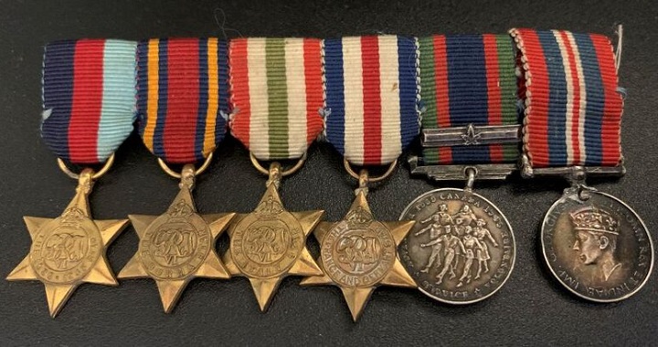 The medals were listed as a 1939-1945 Star, a Burma campaign star, a France and Germany campaign star, an Italy campaign star, a 1939-1945 voluntary service medal, and a 1939-1945 war medal with the Merchant Marines).