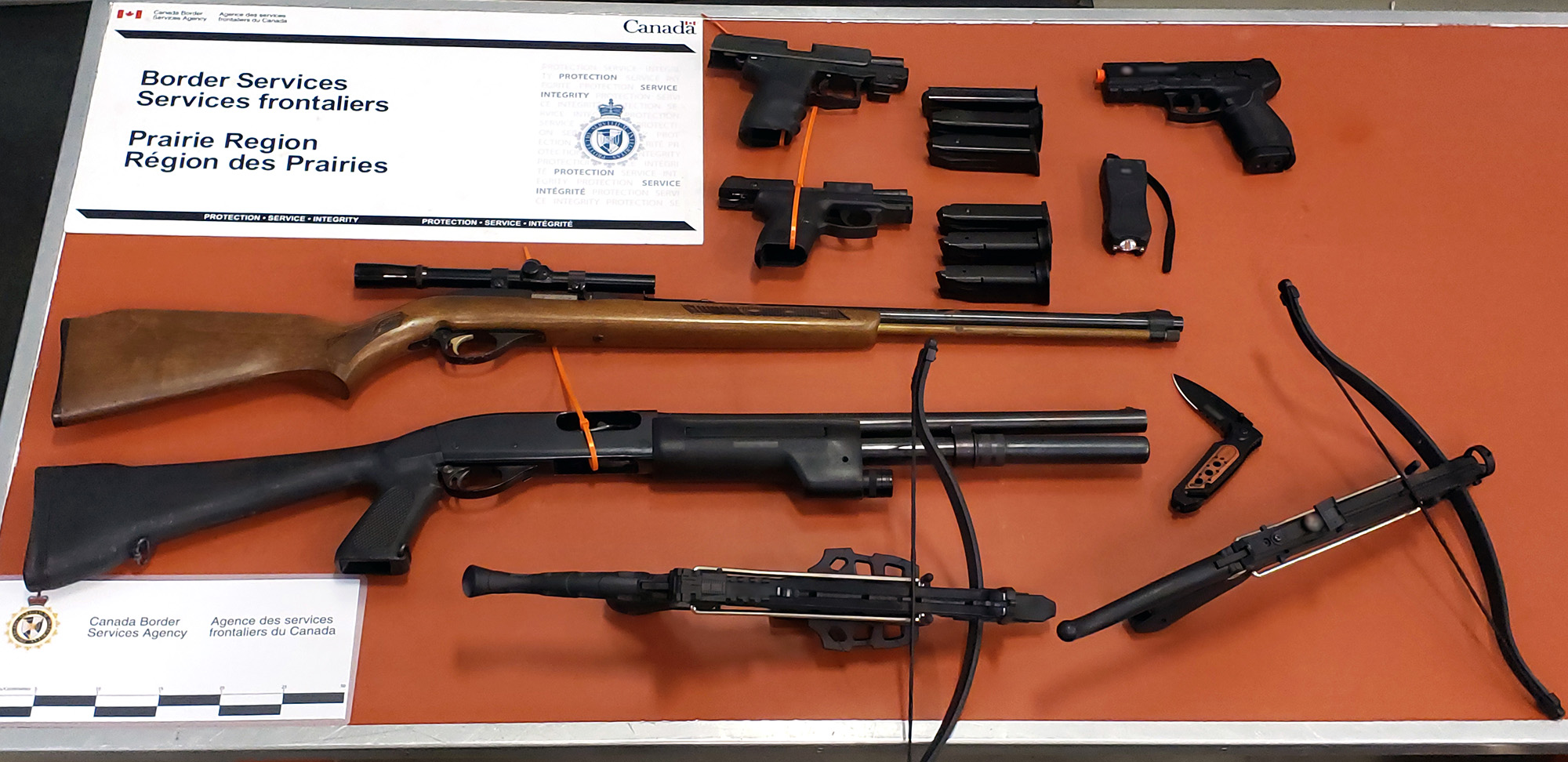 According to the press release, on June 30, CBSA officers seized two pistols, two pistol crossbows, a rifle, a shotgun, a replica firearm, a stun gun, a switchblade and a magazine (for holding bullets and on which there are capacity limits in Canada) from a U.S. man attempting to travel through Saskatchewan on his way to Alaska.