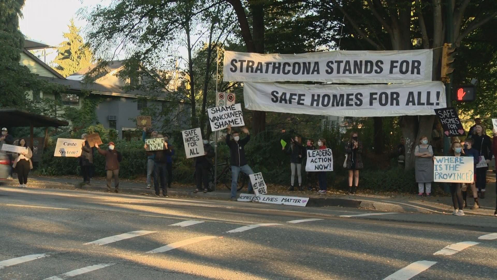 Dozens of residents in the Strathcona neighbourhood in Vancouver rallied Tuesday morning to demand safe housing for those living in the large tent city in Strathcona Park.