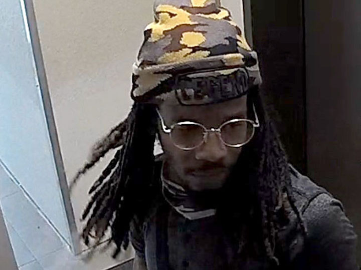 Photos of the man show him wearing a multi-coloured toque, dark clothing and glasses, along with long, black hair.