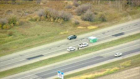 Fatal pedestrian collision on Highway 16A near Veterans Way between Spruce Grove and Stony Plain in Parkland County on Oct. 7, 2020. Global News