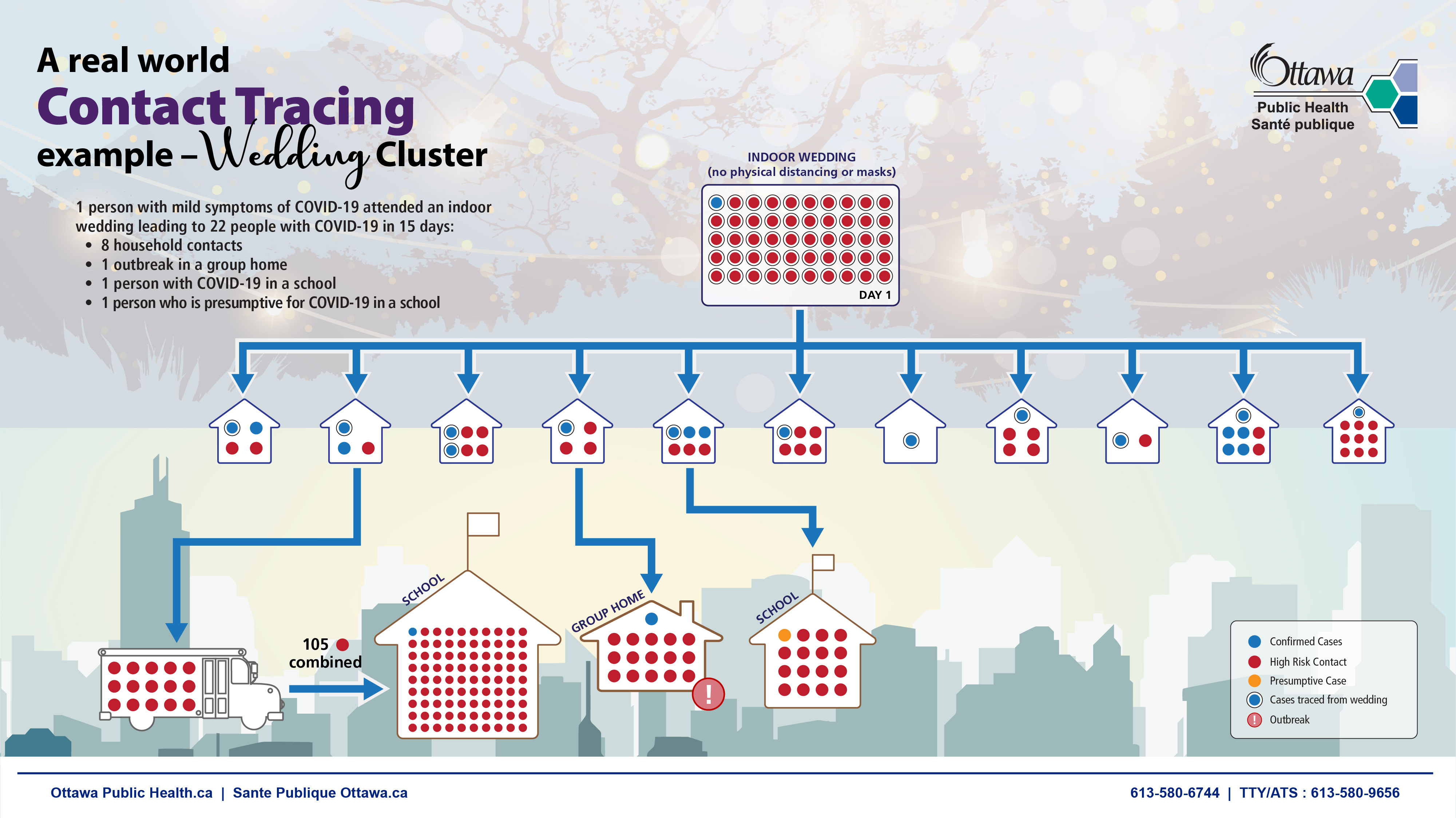 One person who showed up at an indoor wedding in Ottawa with mild COVID-19 symptoms kicked off a chain reaction of transmission that saw 22 people infected and more than 200 people forced to self-isolate in just 15 days, according to the local public health unit.