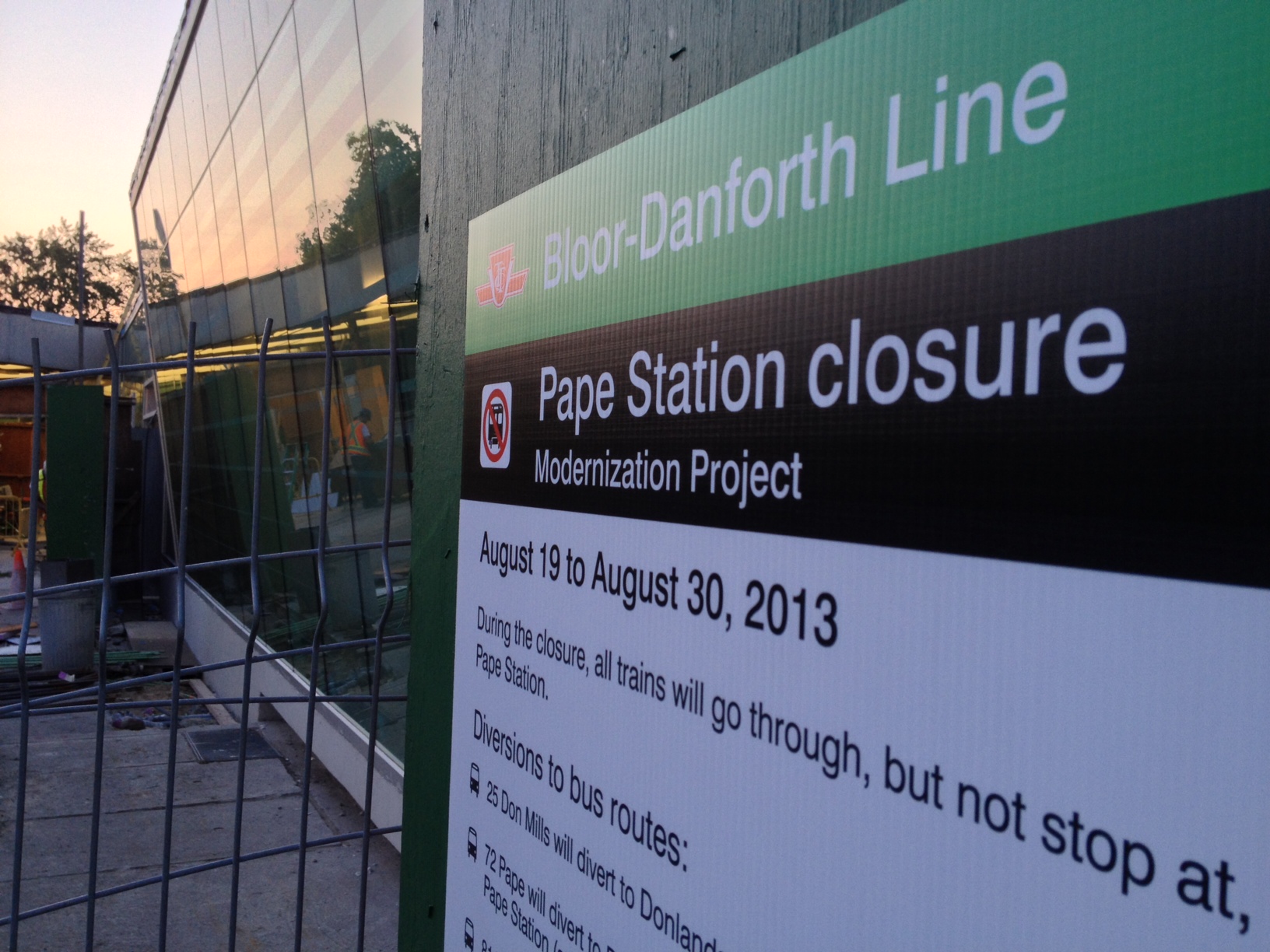TORONTO – The TTC’s Pape Station will be closed from August 19 to 30 as construction crews try to catch up on already delayed renovations.