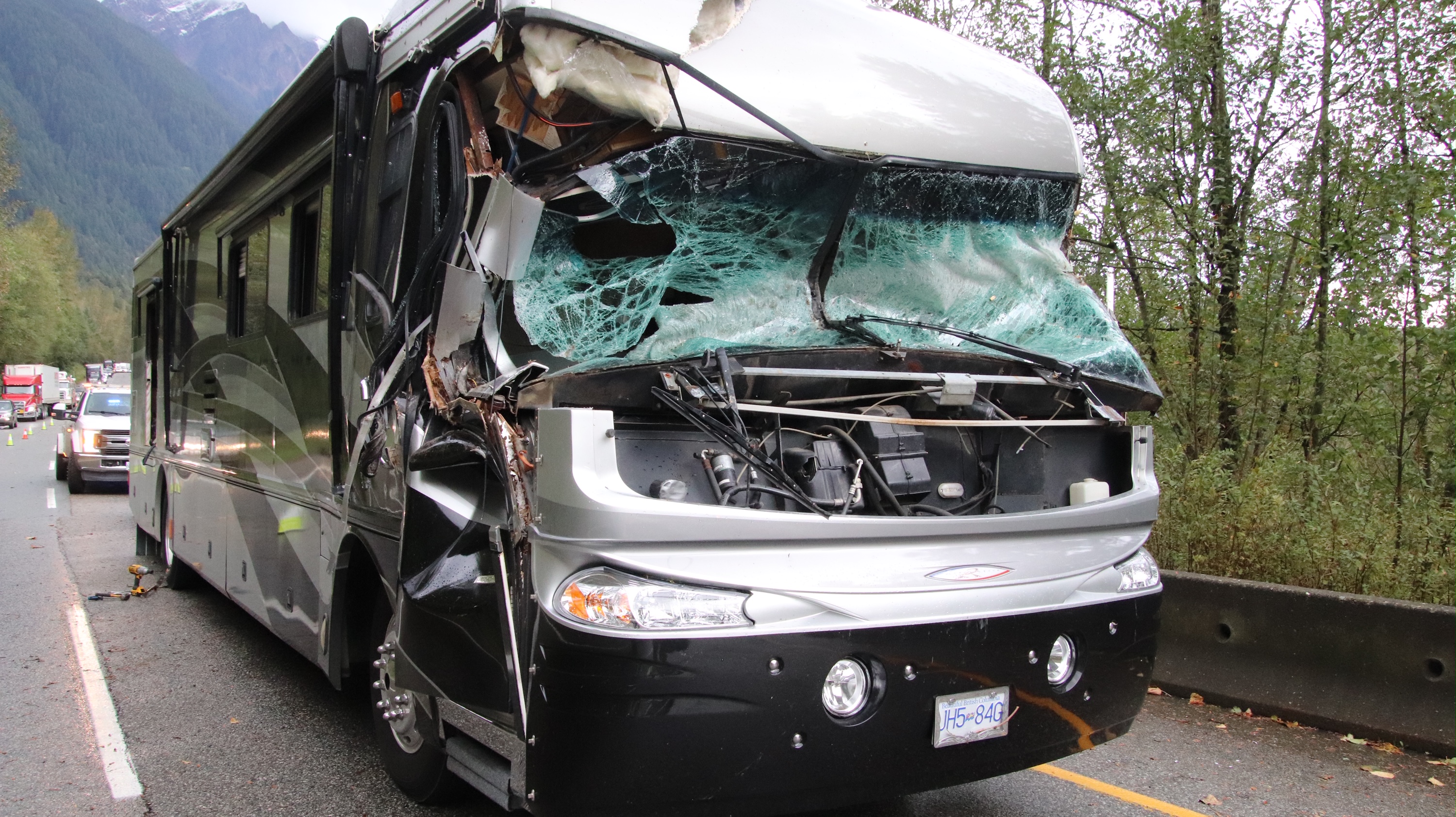 On Highway 1 eastbound by Herling Island, past Agassiz, an RV was hit by a falling tree. No one was hurt.
