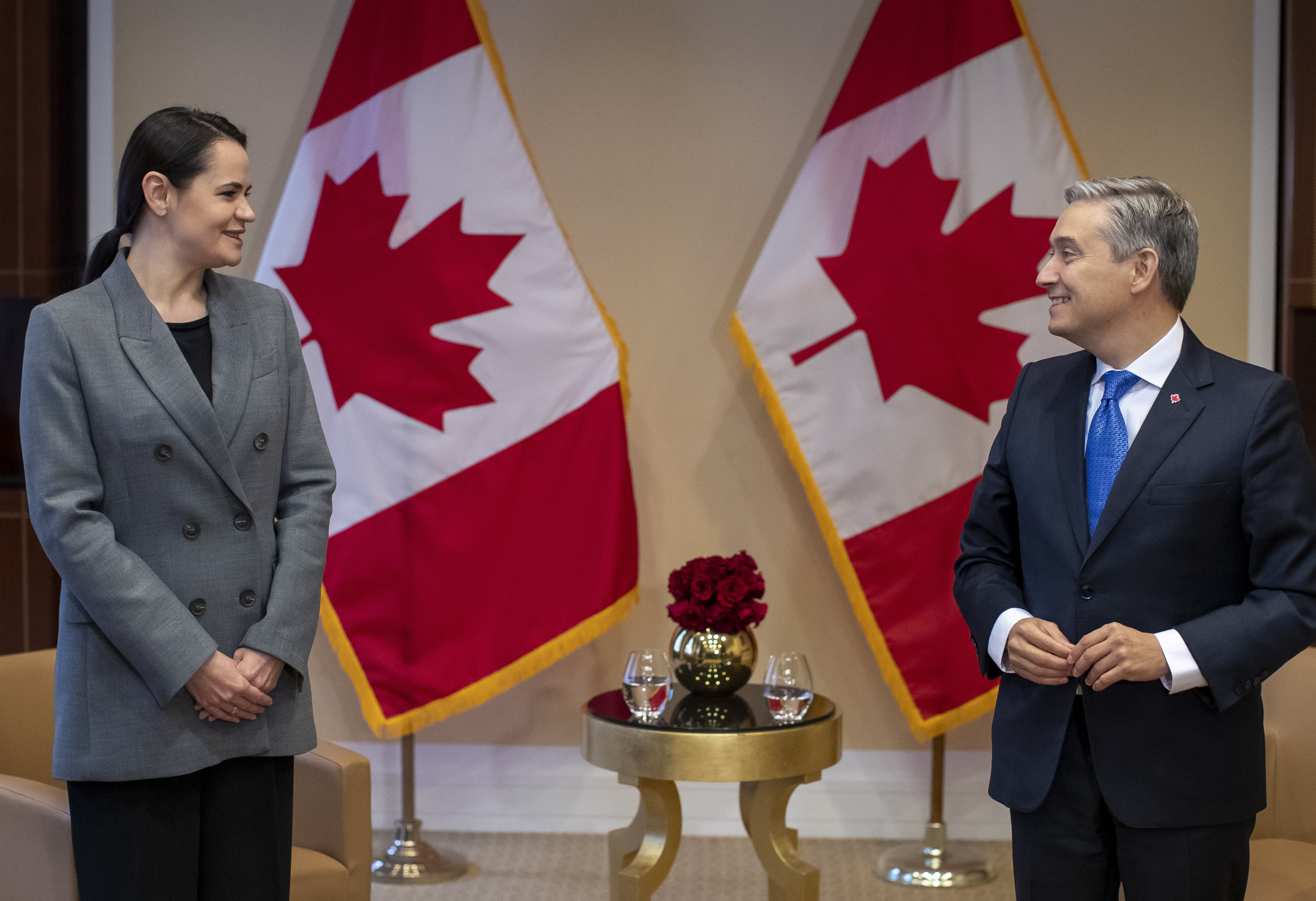 Canada’s foreign minister met Friday with top Belarusian opposition figure Sviatlana Tsikhanouskaya, who is currently in exile in Lithuania.
