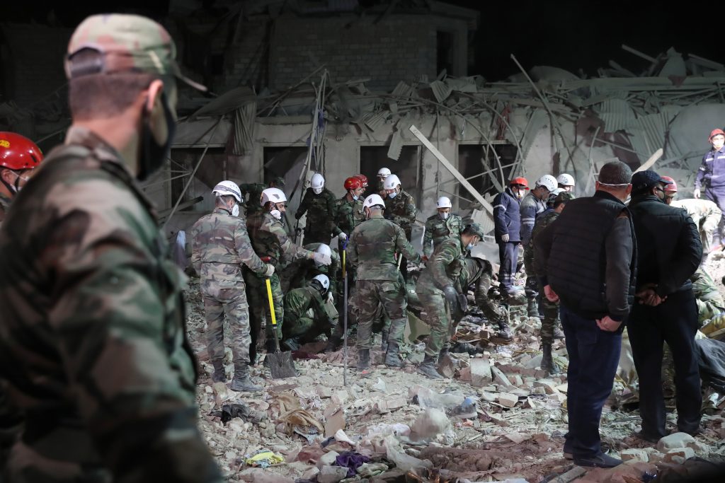 Azerbaijani officials said the Soviet-made Scud missile destroyed or damaged about 20 residential buildings in Ganja overnight, and emergency workers spent hours searching in the rubble for victims and survivors.