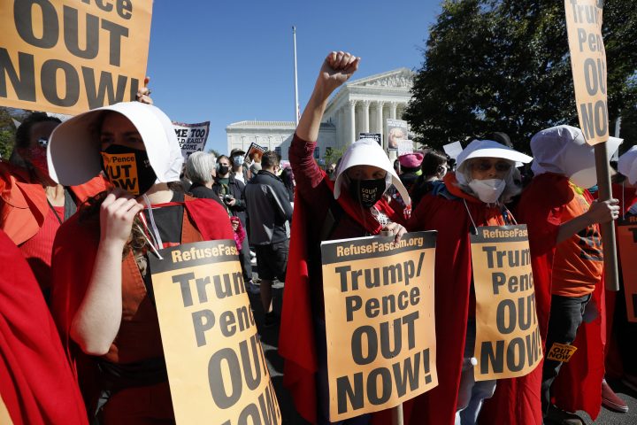 “We Dissent,” said a cardboard sign carried by a young woman wearing a red mask with small portraits of the liberal Supreme Court justice whose Sept. 18 death sparked the rush by Republicans to replace her with a conservative.