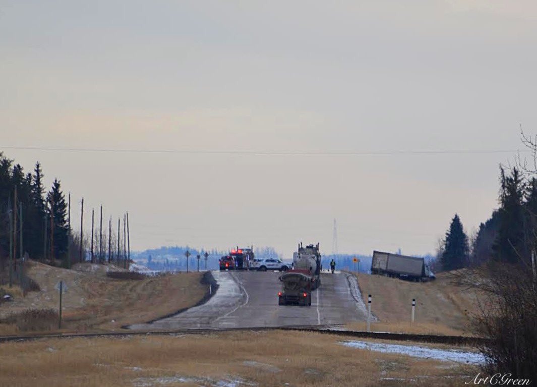 A photo sent to Global News showed a semi in the ditch beside the highway.