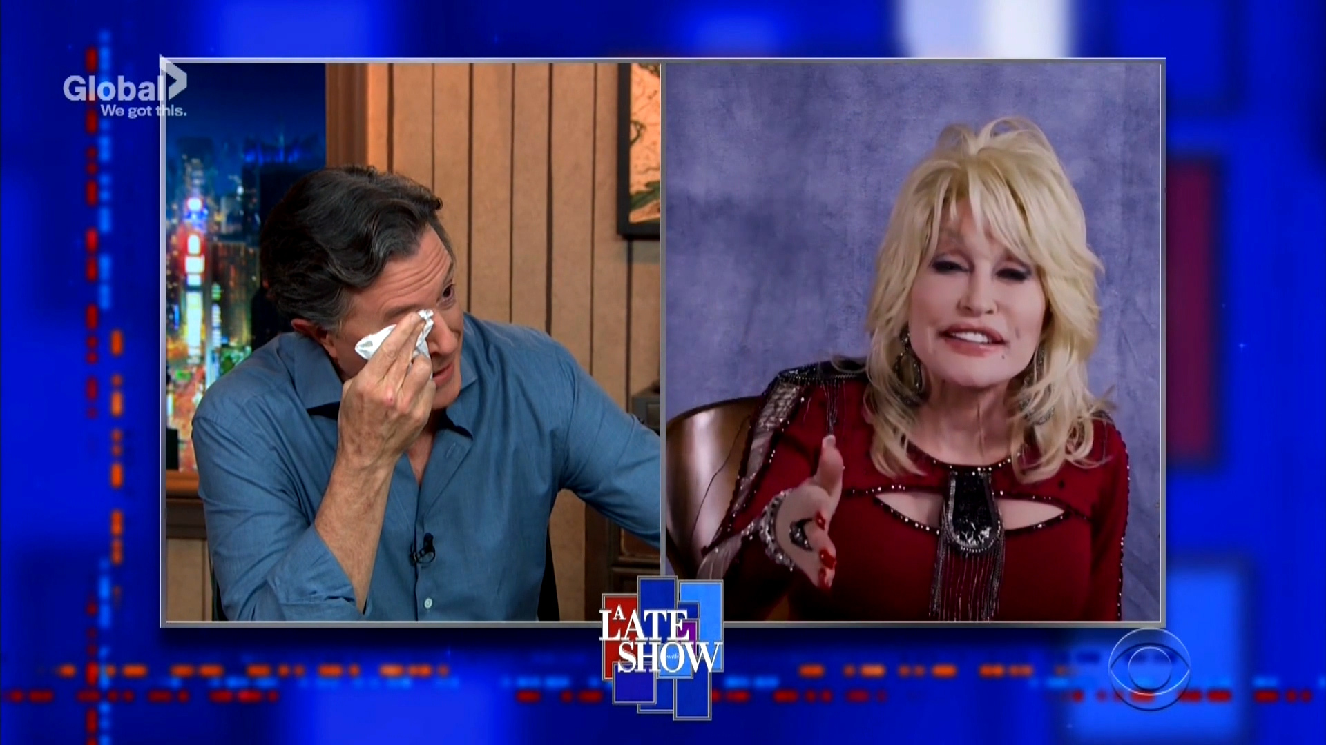 “Like a lot of Americans, I’m under a lot of stress right now, Dolly!” Colbert says, wiping his eyes with a tissue and letting out a little giggle. “You got under my tripwire right there, that was pretty beautiful.”