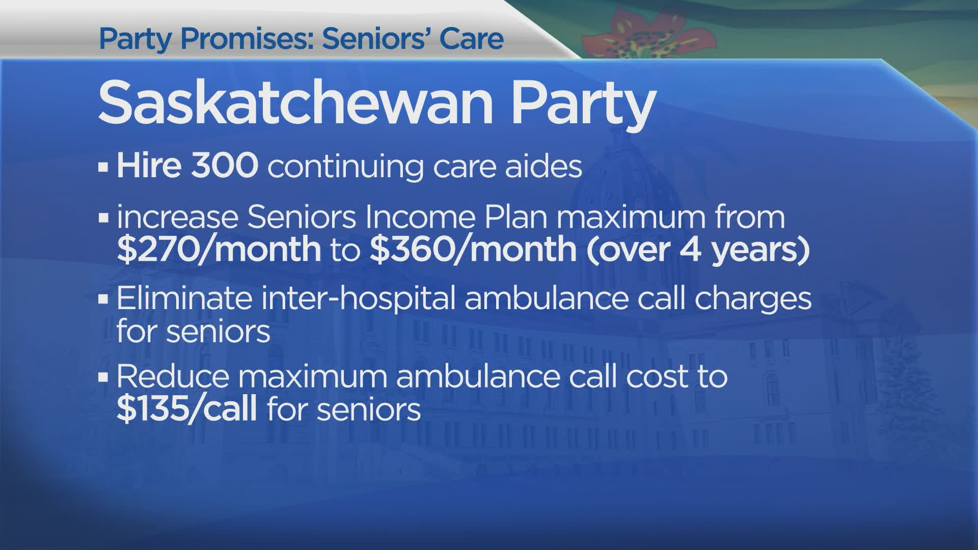 Among other promises, the Saskatchewan Party is pledging to hire 300 new continuing care aides and increase the maximum benefit from the Seniors Income Plan from $270 per month to $360 per month over four years.