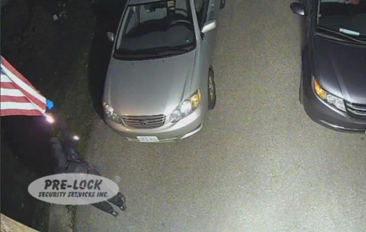 The video appeared to show a man walking up to the driveway and grabbing at the handles of two vehicles in the driveway, before going straight to the flag. Seconds later, the suspect can be seen lighting the bottom corner of the flag.