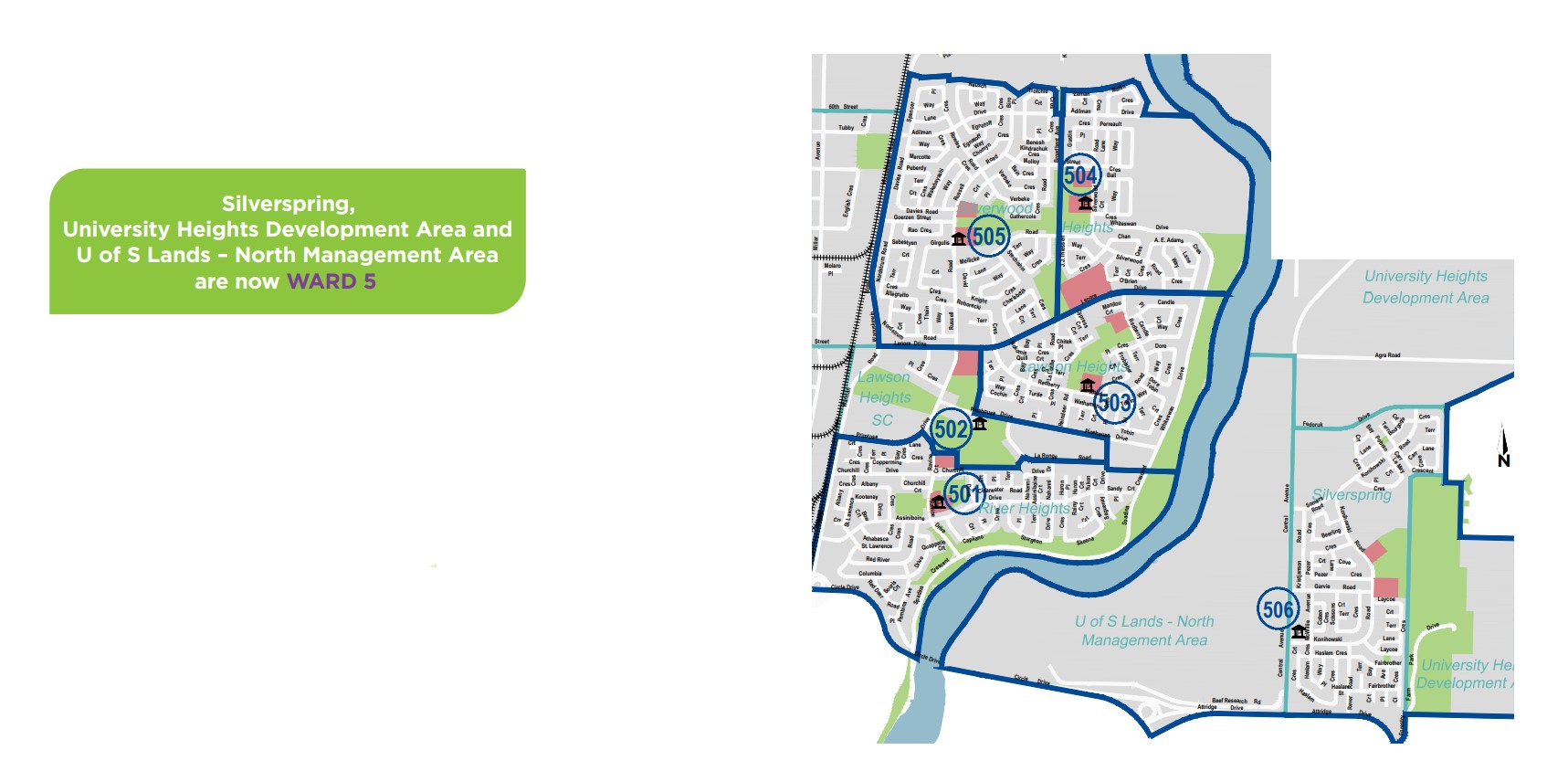 Added to the ward is the Silverspring neighbourhood, along with the University of Saskatchewan – north management area and the University Heights development area.