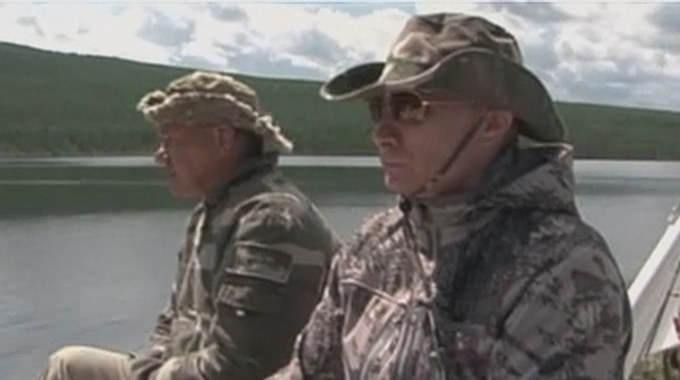 Russian leader Vladimir Putin was putting on another show of manliness during his latest action-packed excursion captured in this video released by Russian state media. Putin, going shirtless at one point (of course, he did), catches several large fish including a 46 pound pike. He is also a friend to the local wildlife as he’s seen feeding a reindeer.