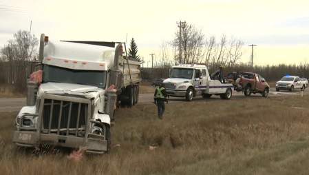 A crash between a red pickup and a semi dump truck happened north of Devon on Highway 60 around 12:30 p.m. Wednesday, Nov. 4, 2020. Global News