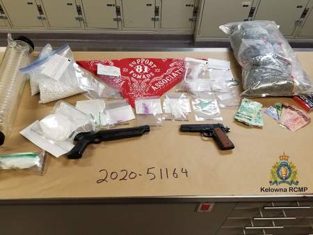 Weapons, cash and suspected drugs were seized during a search warrant in Kelowna on Wednesday.
