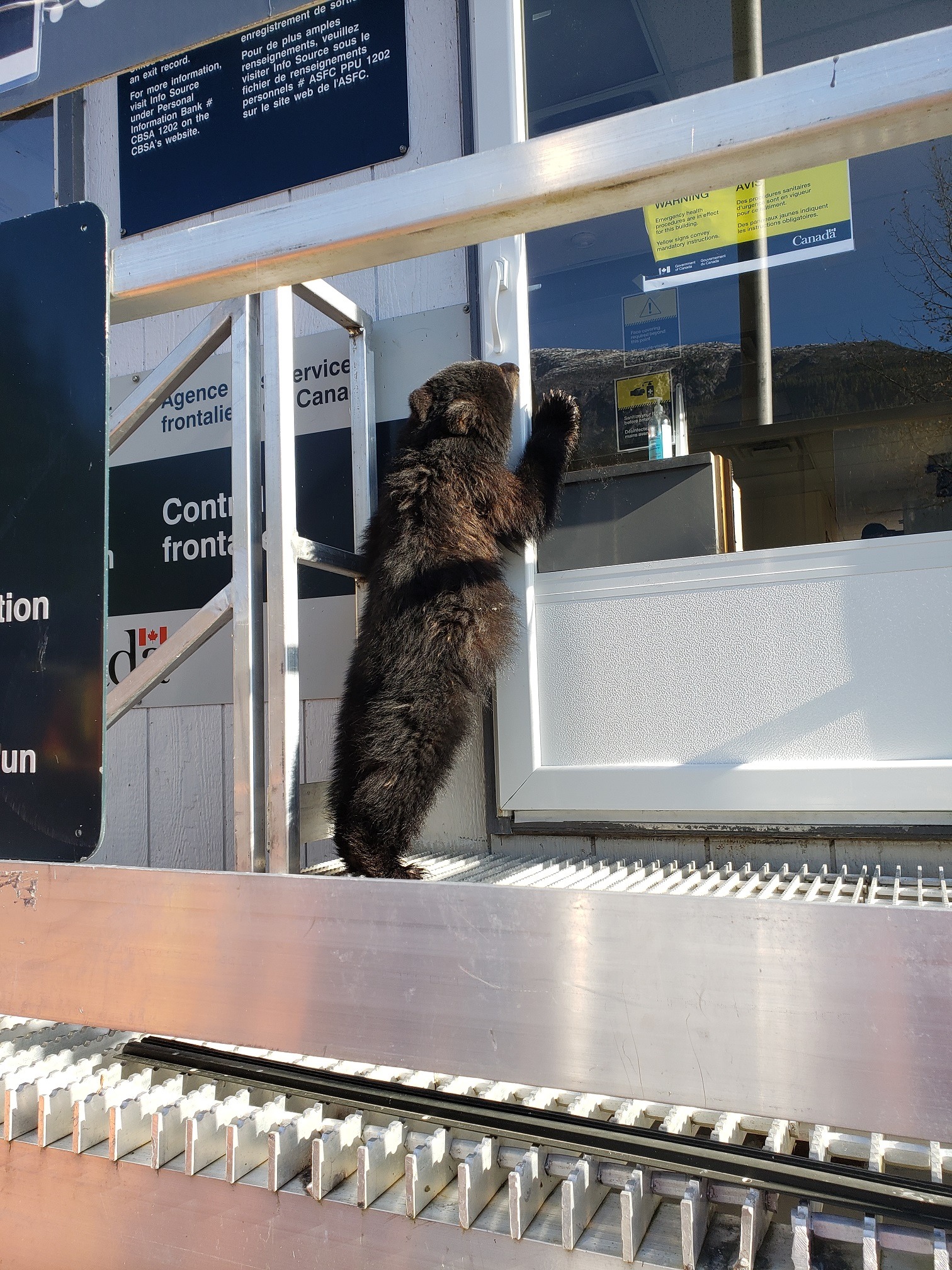 The bear, which was very interested in the Canada Border Services Agency office in Stewart, was “seeking entry for essential reasons but had no travel documents,” according to the department’s Facebook post.