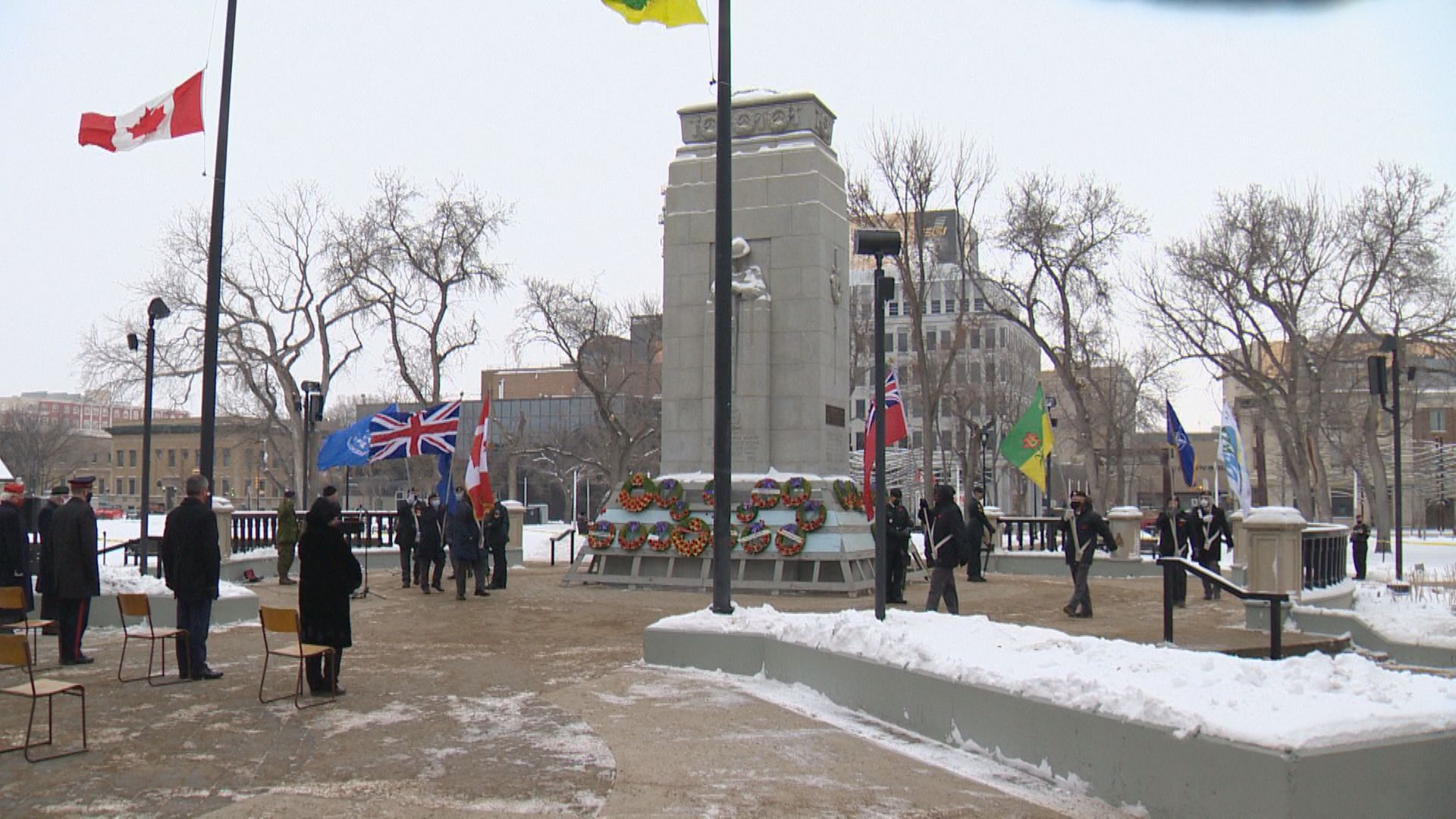 But this year, because of COVID-19 guidelines, only 30 people could participate. Residents were advised not to attend, but instead, were told to watch the livestream at home. Still, a small crowd formed outside a taped-off barrier to pay their respects. Wreaths were also laid ahead of time and the service at the Brandt Centre was cancelled.