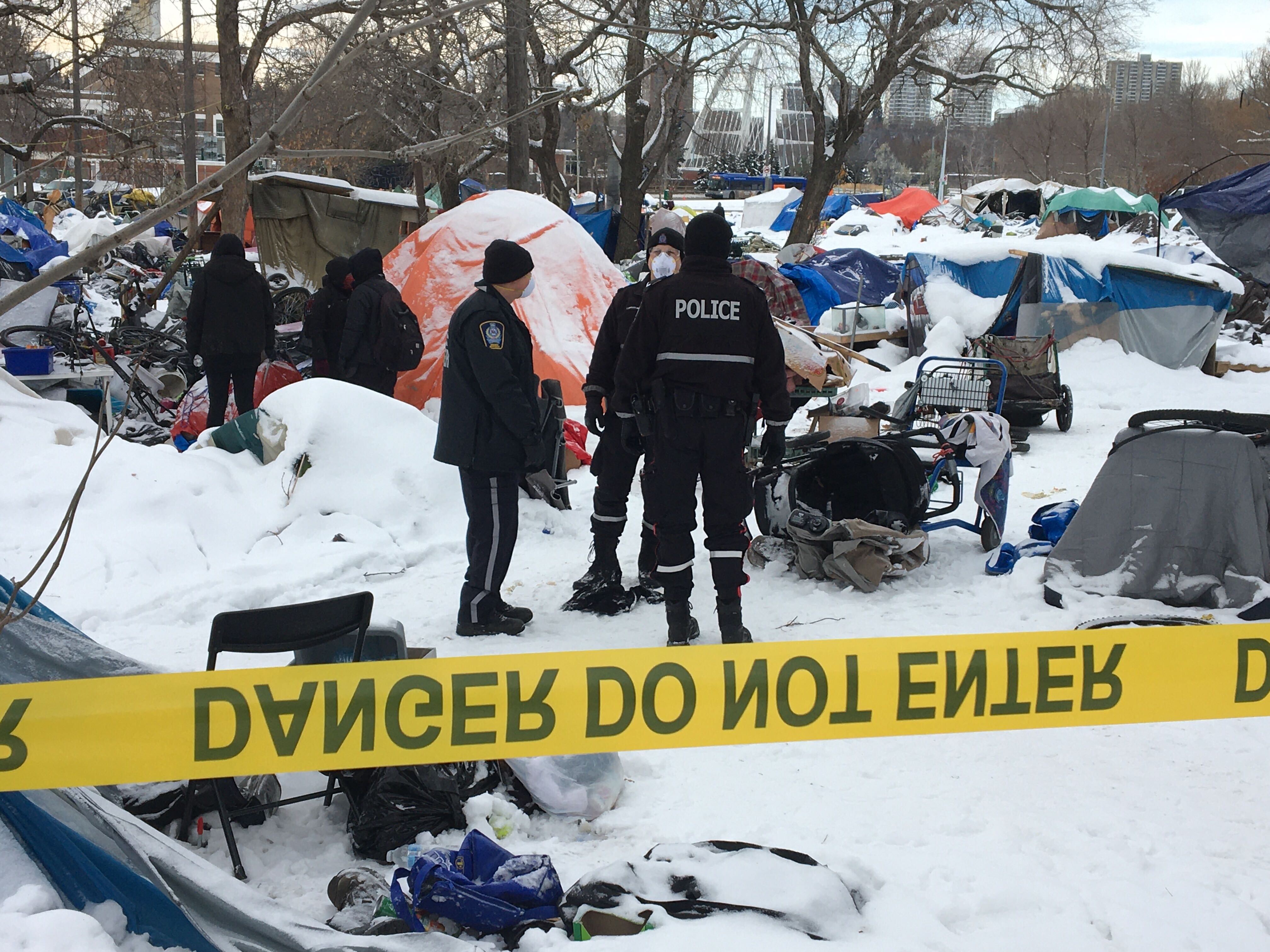 After closure notices were posted at the encampment in Rossdale on Nov. 8, Edmonton police and city staff were on site Thursday help relocate people and begin the clean-up process.