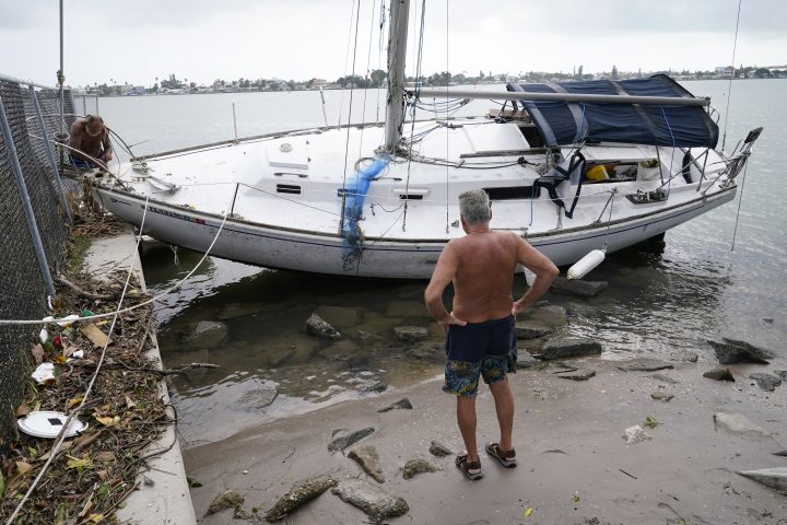 Several sailboats broke free from their moorings and washed ashore in Gulfport, Florida, including the vessel where Mo Taggart has lived for two years with her dog. She thinks the boat is a total loss.