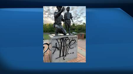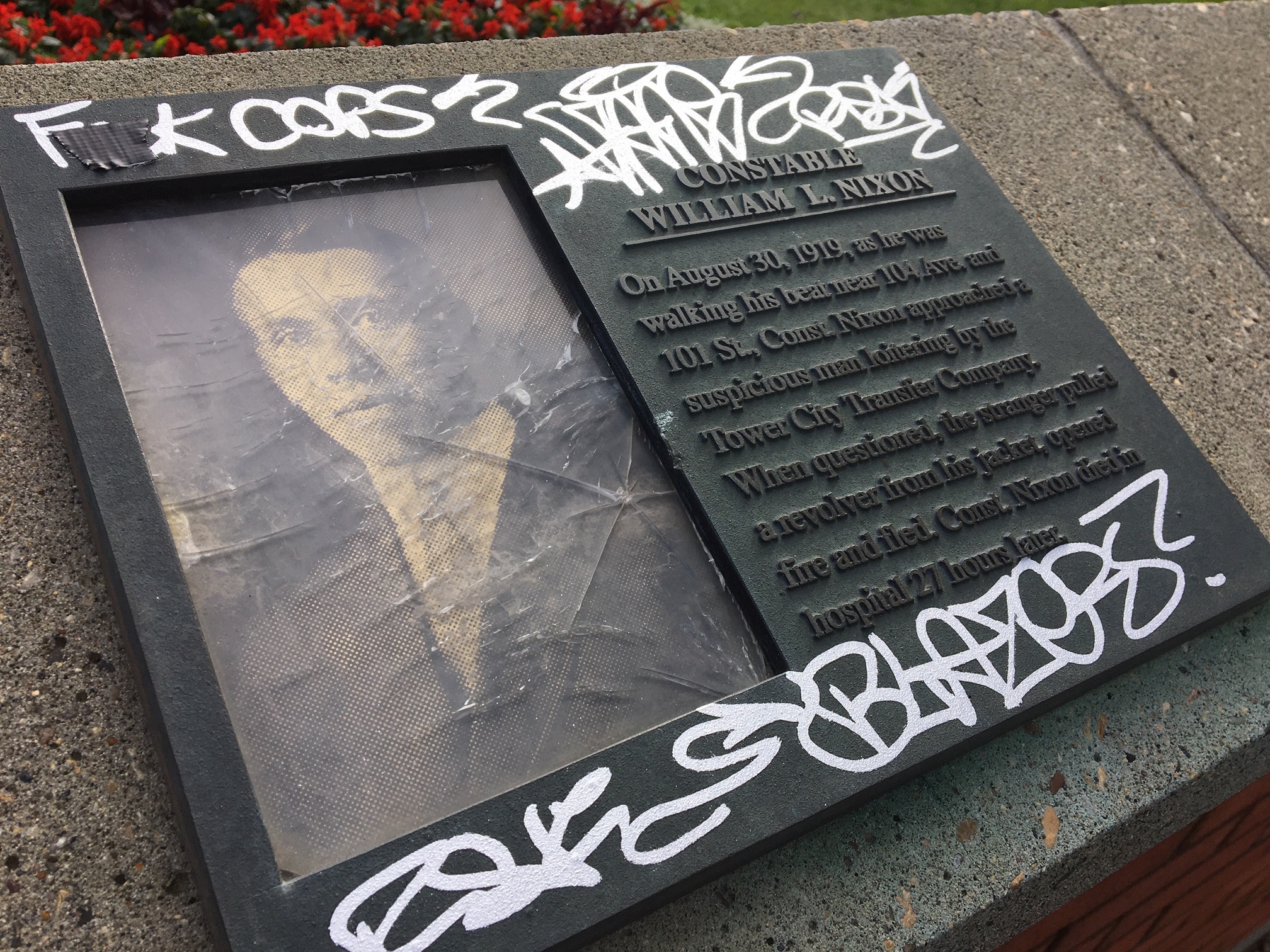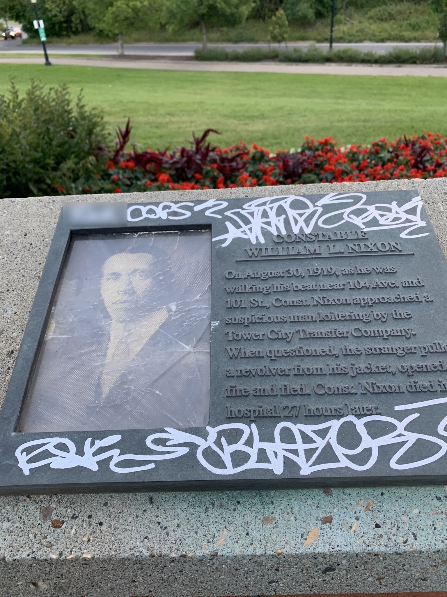Tags and the words “F*** cops” were written on a statue and a plaque in Constable Ezio Faraone Park on Sept. 3.