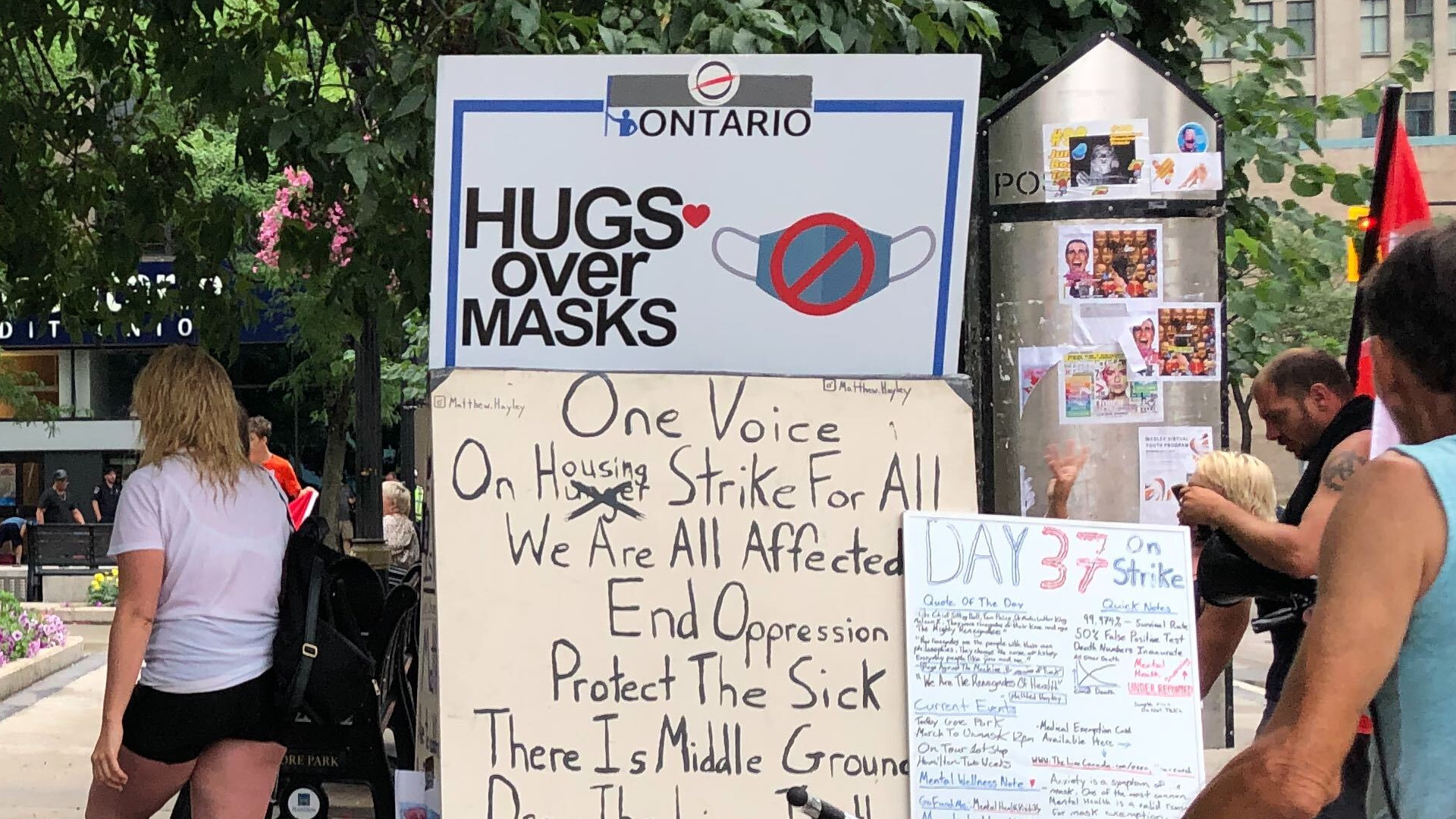 More than 100 people showed up at city hall on Nov. 8 for the “Hugs Over Masks” event, protesting restrictions under the Reopening Ontario Act, according to investigators.