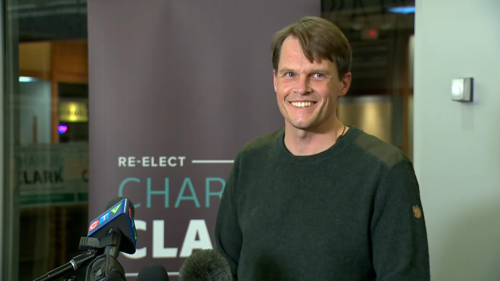 “I’m very honoured to be standing here today with a mandate for another four years,” Clark said at his campaign office.