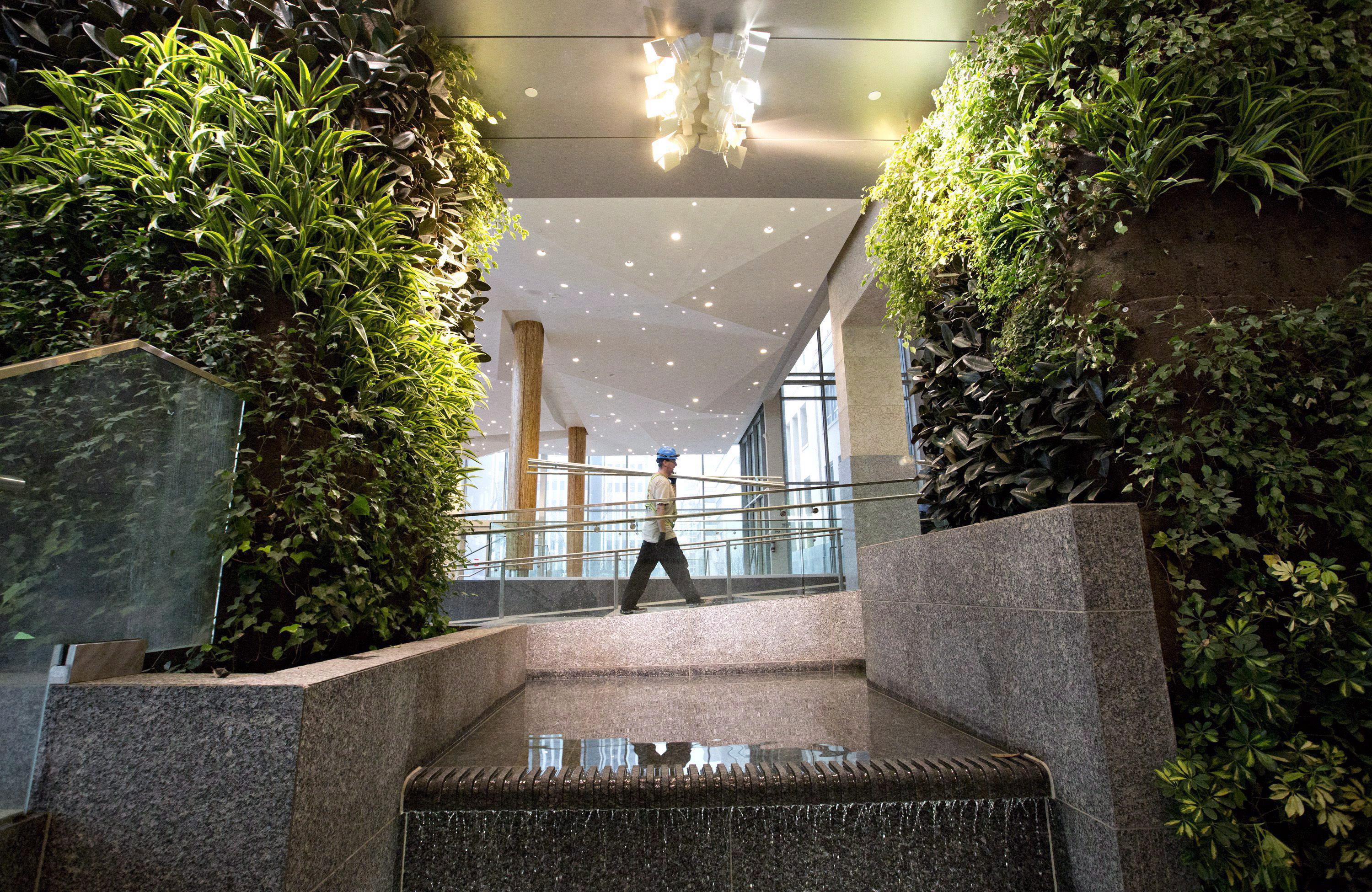 The plant installation encompasses about 2,400 square feet of the entrance atrium, which also has six kinds of marble, nickel-plated doors and unique light fixtures and ceiling accents.