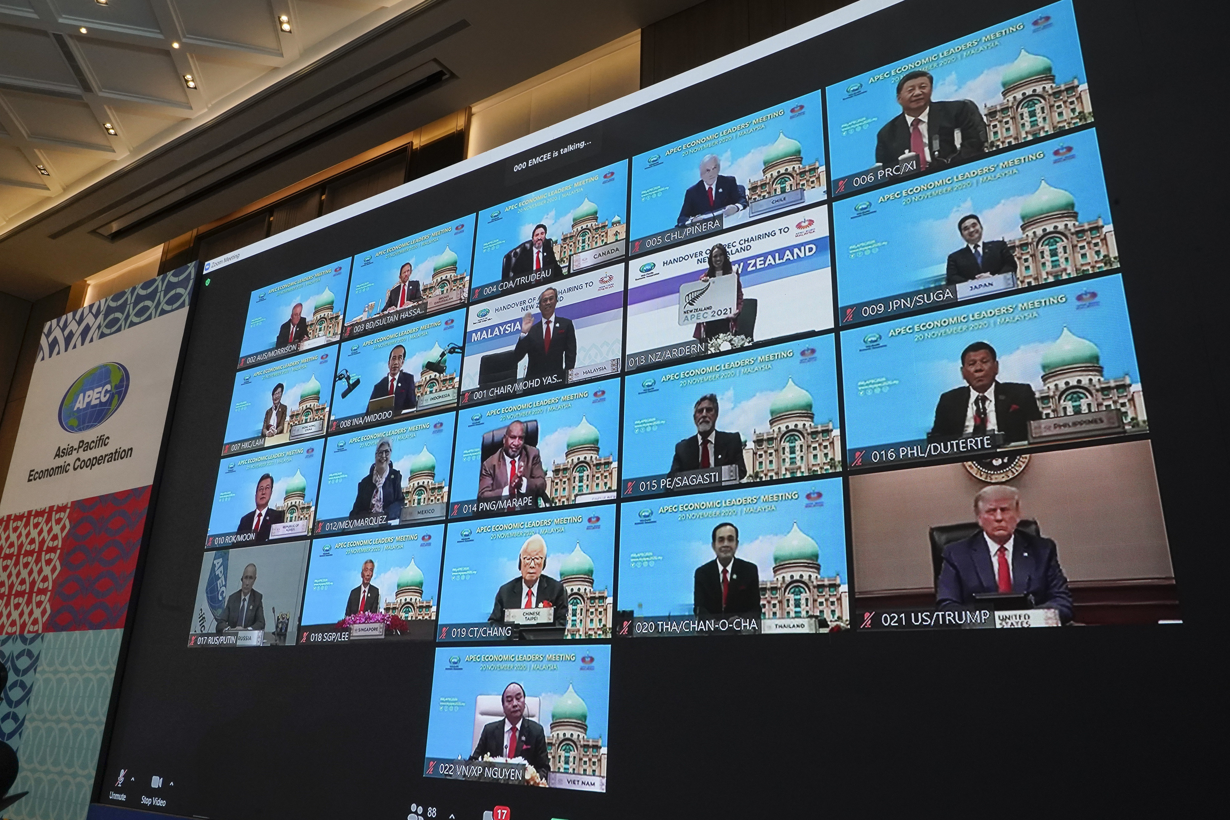 The 21 APEC leaders stressed “co-ordinated action” on the pandemic at the meeting, hosted by Malaysia but held online because of the virus. They extended the sentiment of co-operation to international business, with signatories pledging “free, open, fair, non-discriminatory, predictable trade.”