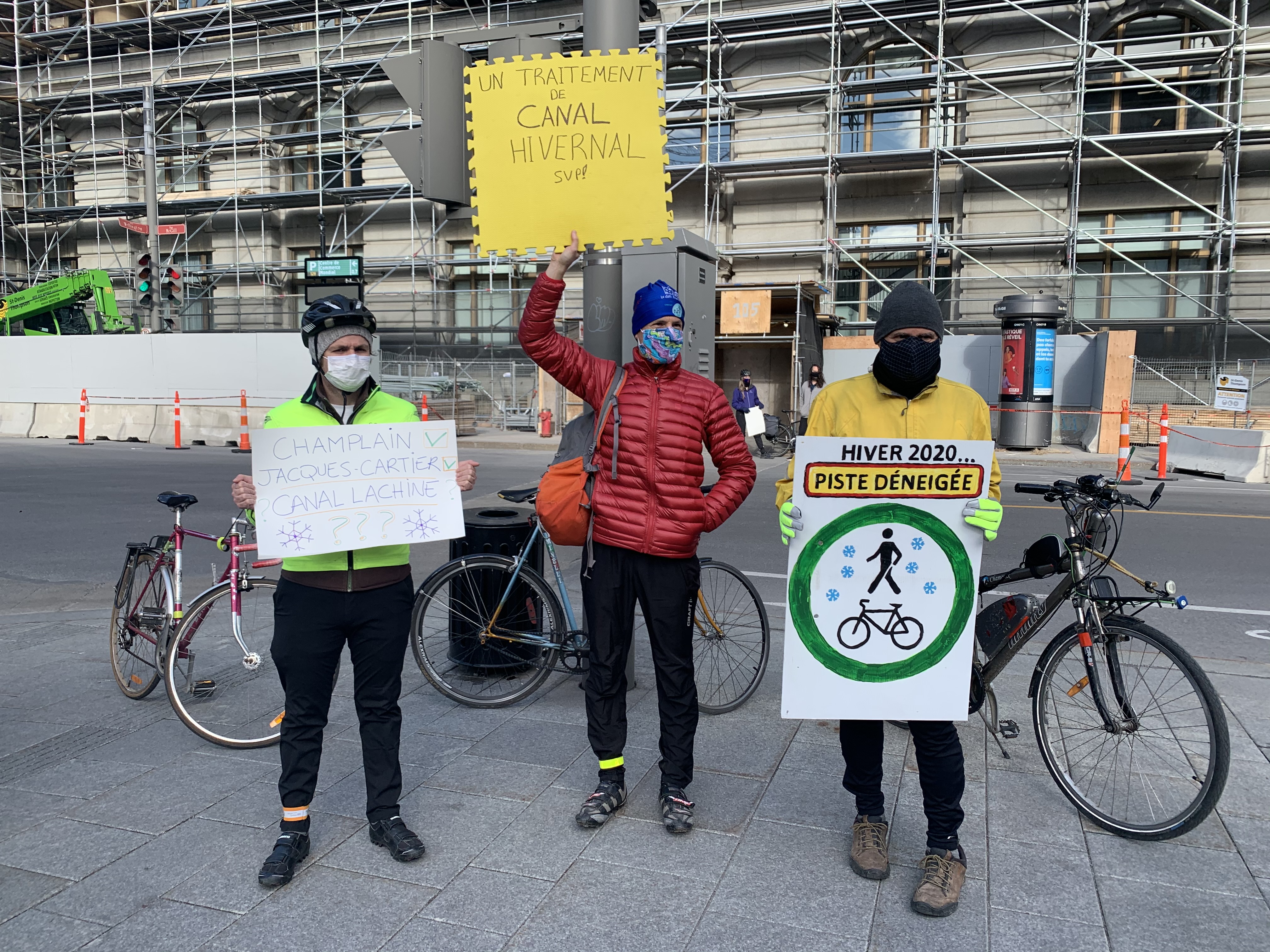 Dozens of riders gathered outside Parks Canada offices in Old Montreal on Saturday, asking the federal agency that owns the land to clear snow off the path this winter.