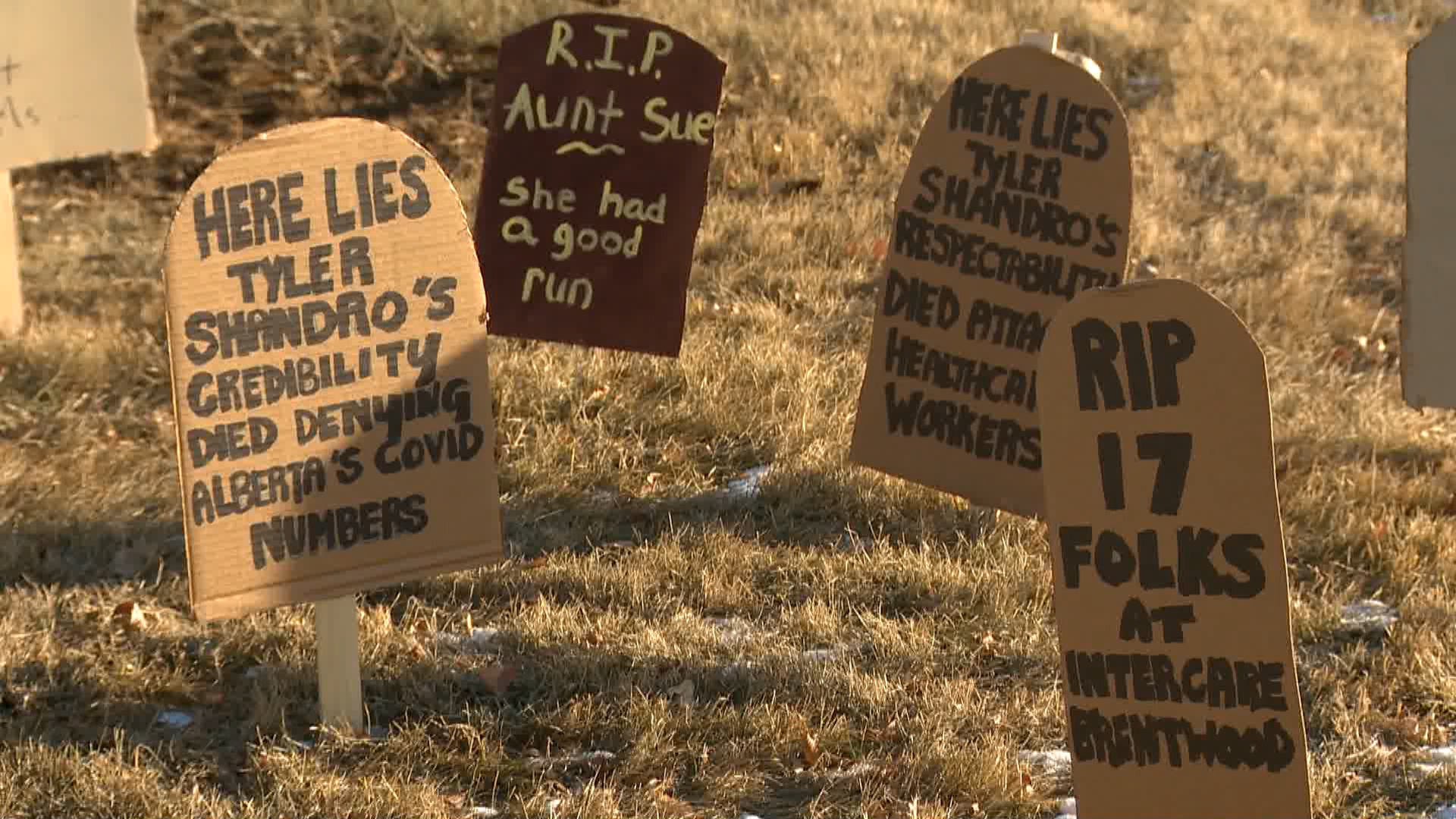 More than a dozen hand-made painted cardboard gravestones were set up in a grassy patch across from Shandro’s office, both criticizing the minister’s response to the COVID-19 health crisis as well as drawing attention to some of the hundreds of Albertans who have died from the illness.
