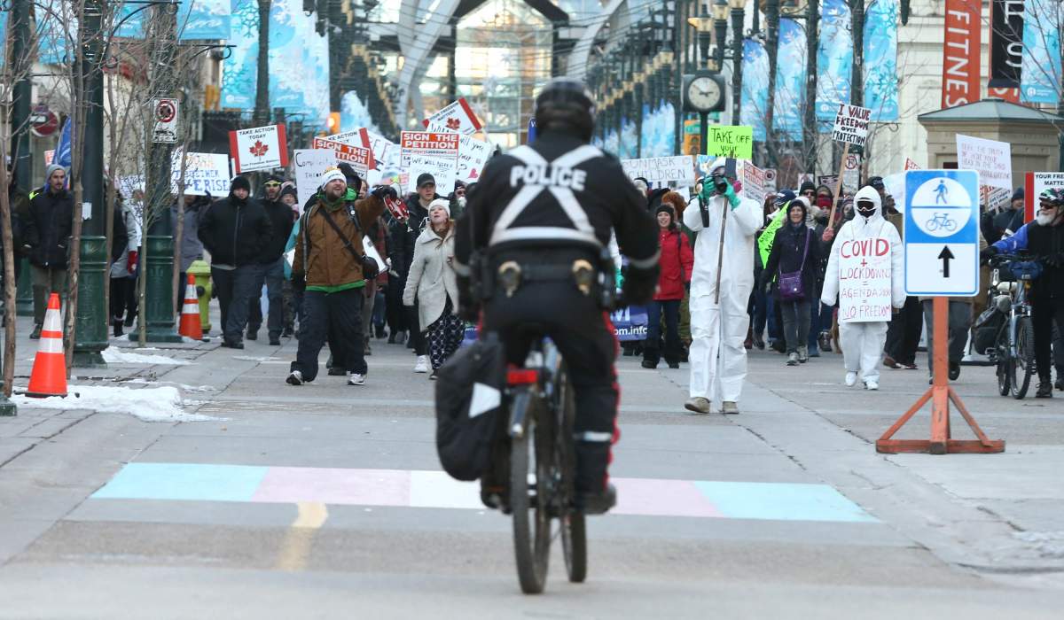 The “Walk for Freedom” march started at city hall and continued on Stephen Avenue. Many of those in attendance could be seen not wearing masks.