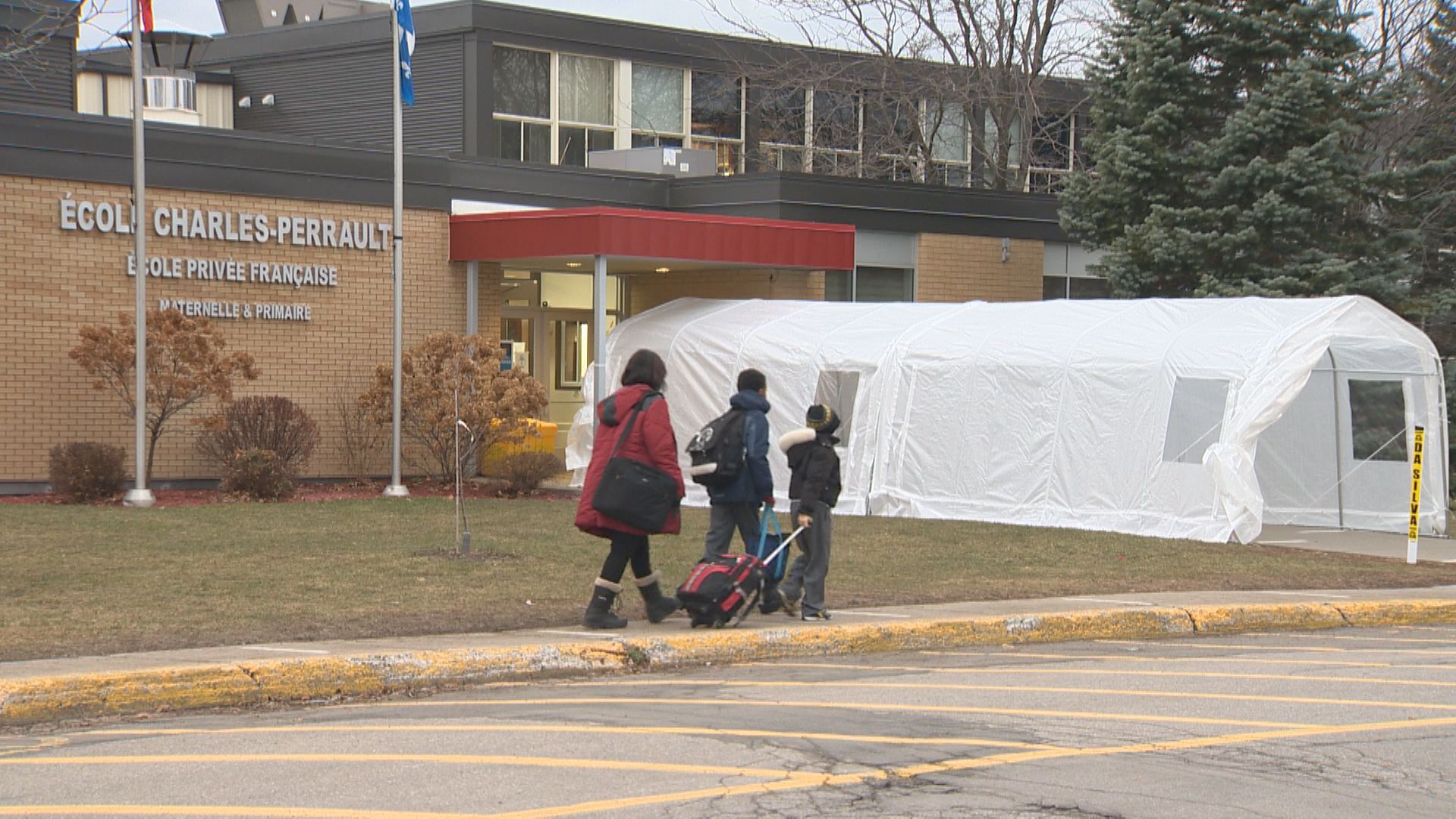 The plastic tunnels provide shelter from the elements while children are screened before entering the building.