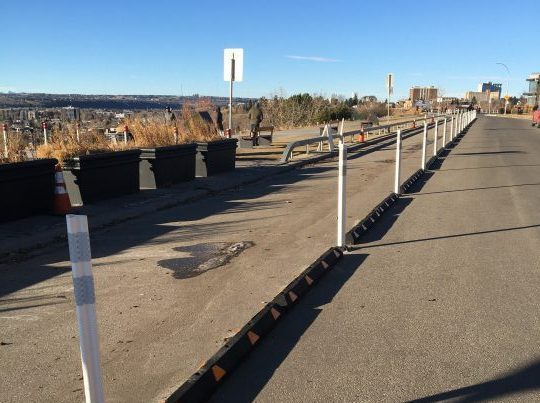 Orange barricades were replaced this weekend with white poles and black parking lot-type barriers to create a new bike and pedestrian lane.