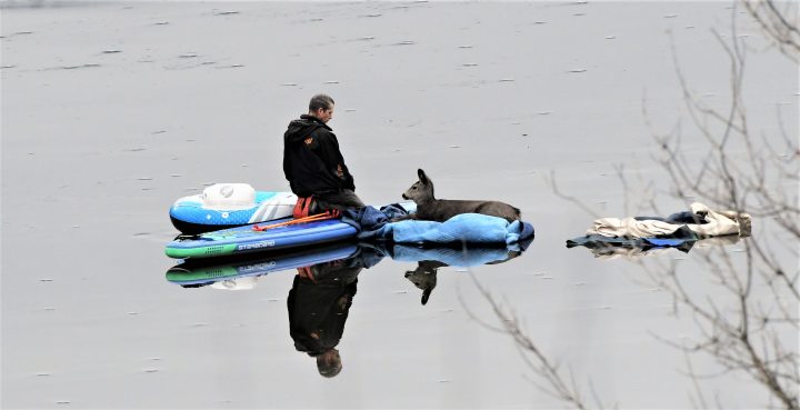 An Okanagan man witnessed a remarkable rescue on Tuesday, with a man on a paddleboard saving a young deer from potentially drowning.