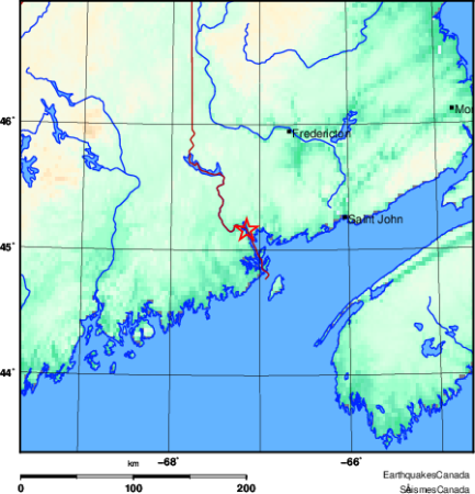 Earthquakes Canada says that two minor earthquakes roiled an area near the New Brunswick-Maine border, approximately 10 kilometres northwest of St. Andrews.