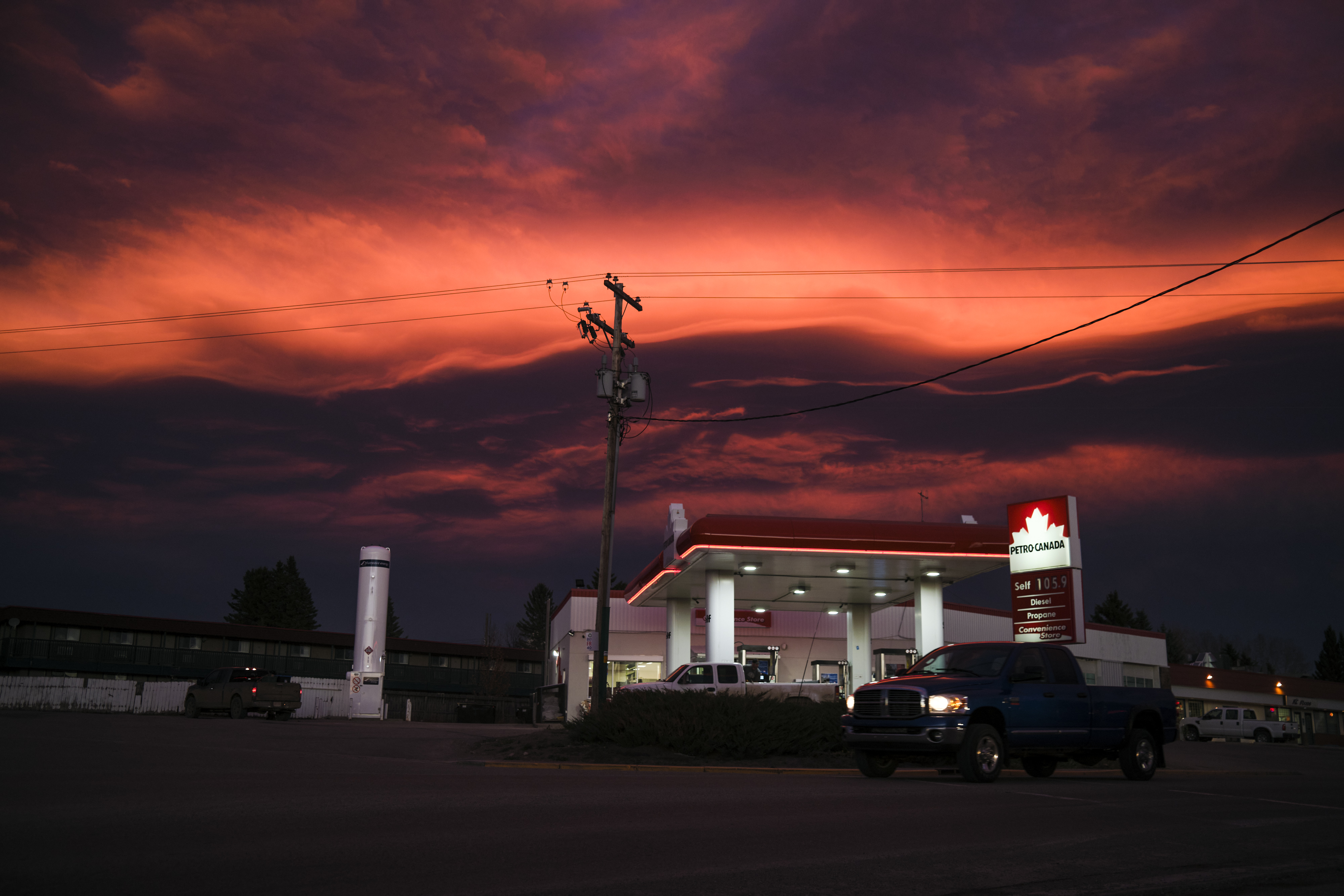 Clouds reflect the sunset over a Petro Canada gas station in Cremona, Alta., Monday, Nov. 2, 2020. THE CANADIAN PRESS IMAGES/Jeff McIntosh