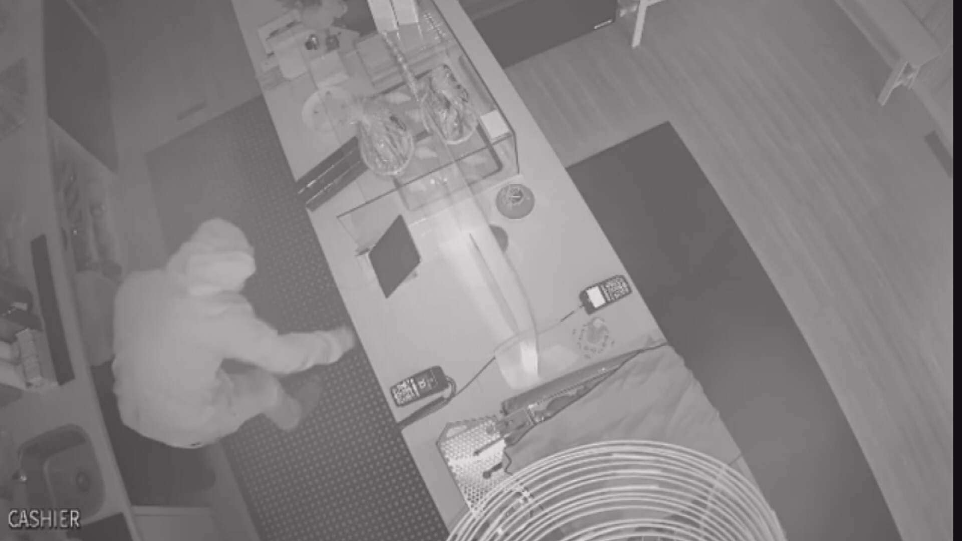 The apparent thief, who was wearing a long-sleeved hoodie, made off with a little cash from the register, an envelope full of tips and a laptop.