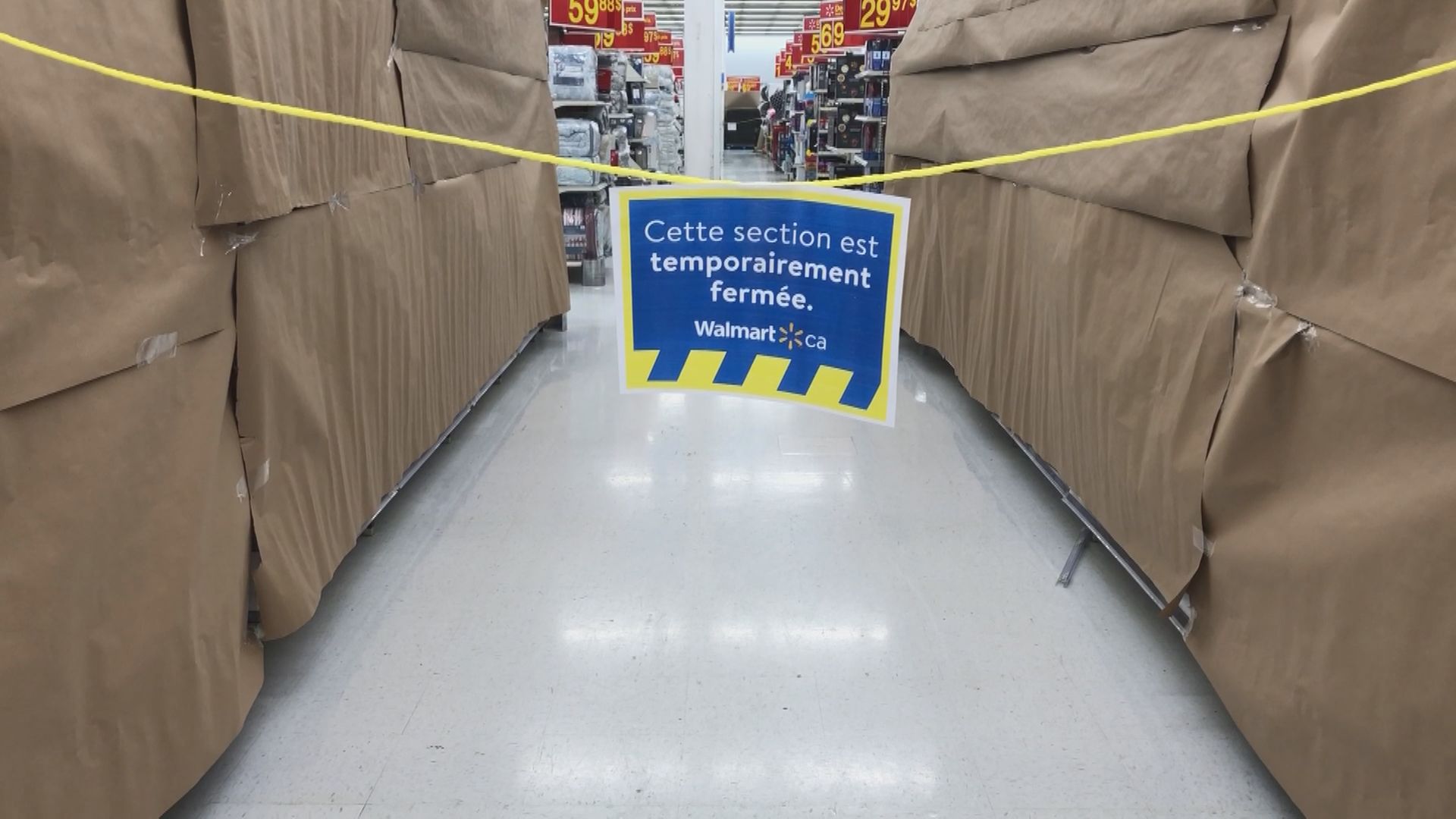 Aisles are cordoned off and shelves are covered in paper and plastic. Non-essential items like toys and clothing cannot be sold.