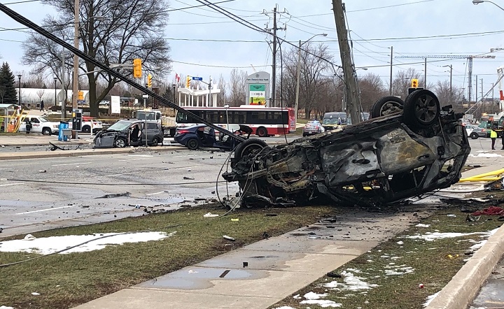 One of the vehicles rolled over, ended up on a sidewalk and sustained fire damage. Two other vehicles were also damaged and debris was scattered across Keele Street. Multiple poles and signs were also hit during the crash.